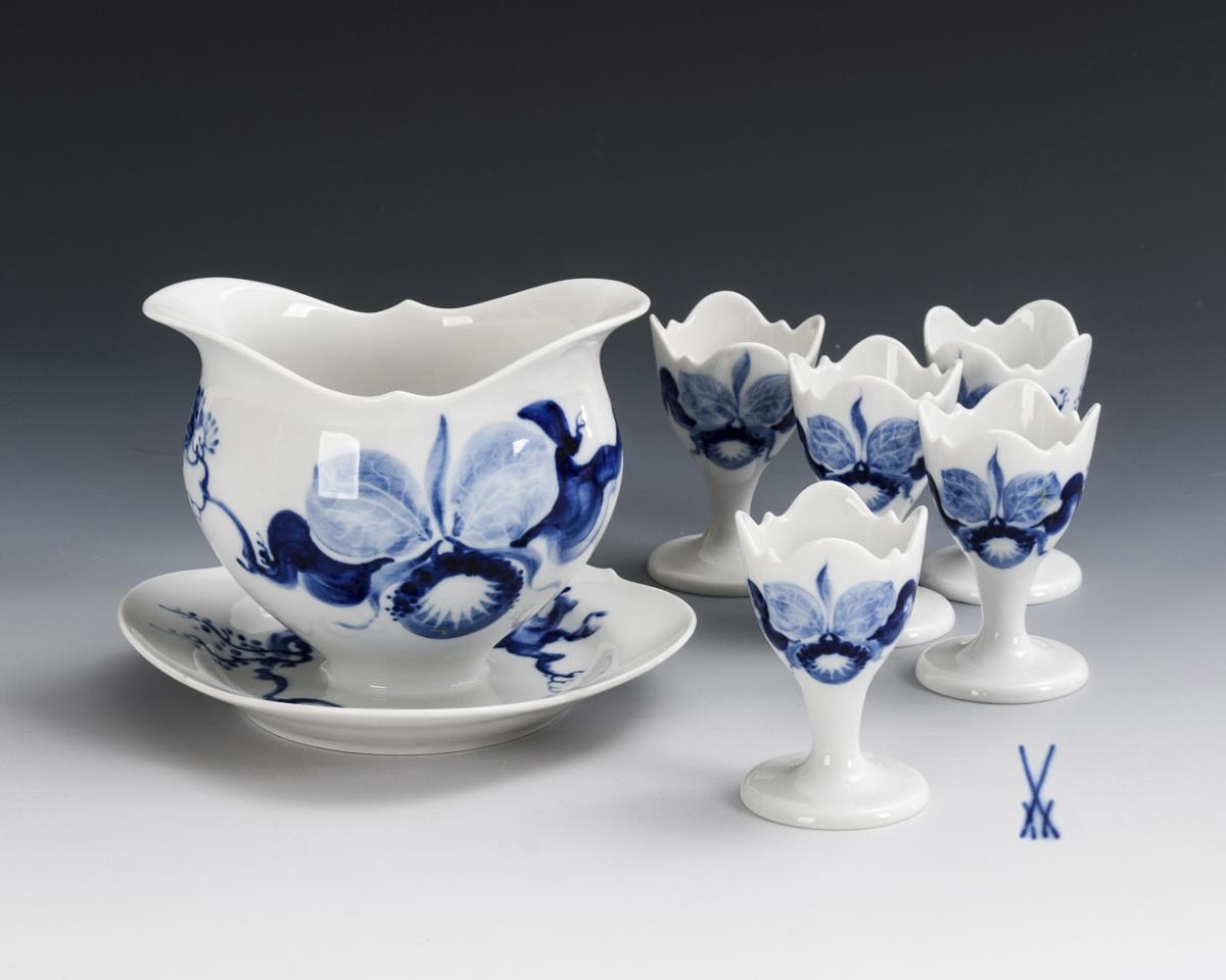 Saucier and 5 egg cups "Blue orchid on branch". Meissen.