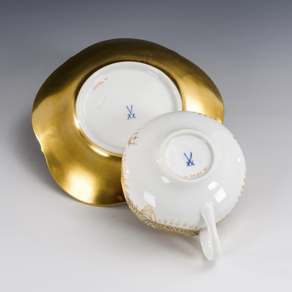 Polychrome painted, richly decorated with gold. H cup 5 cm, Ø saucer 15.5 cm.