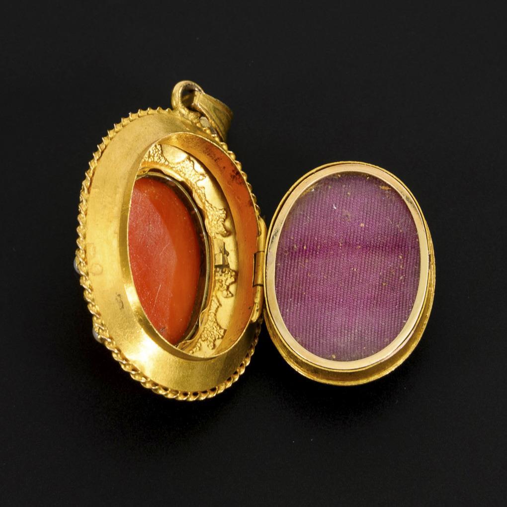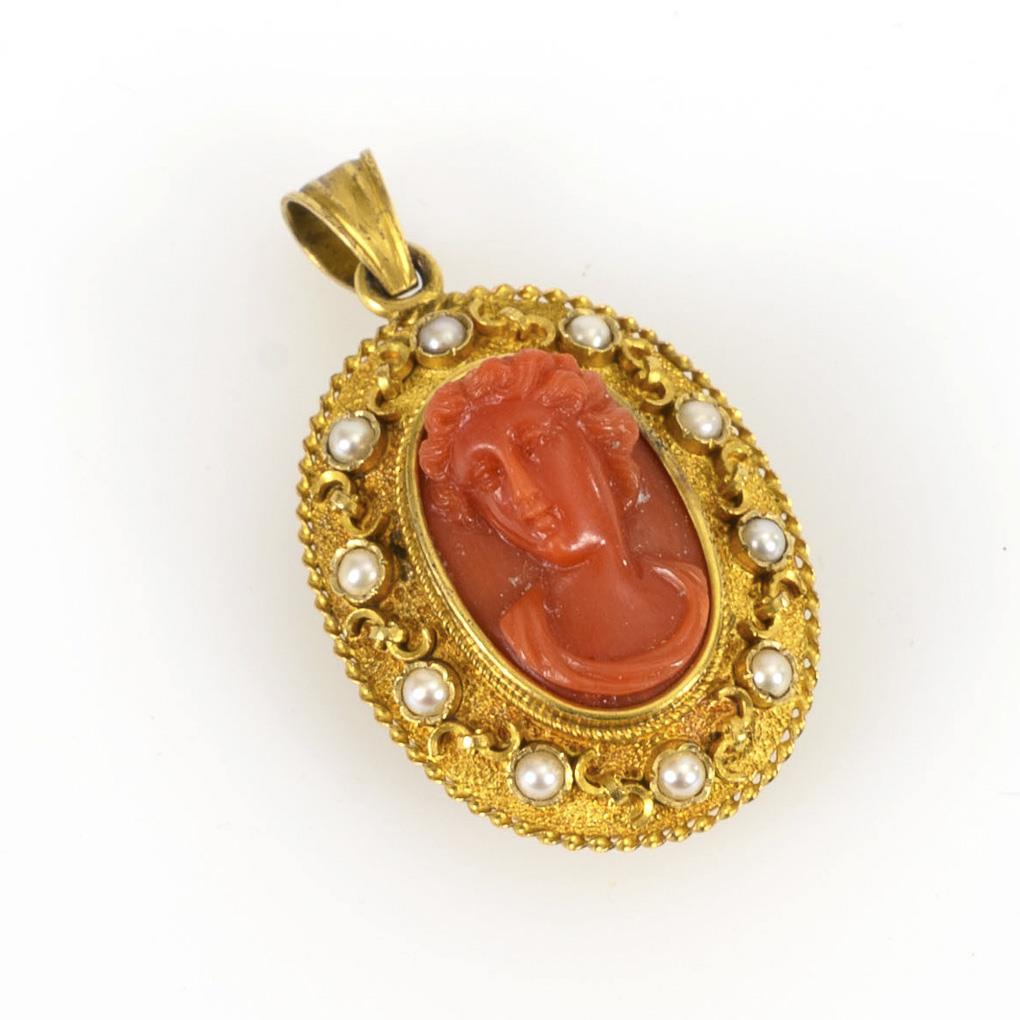 Frame-set coral cameo with cut female profile head surrounded by small pearls on decorative frame. Glazed framed inner compartment.