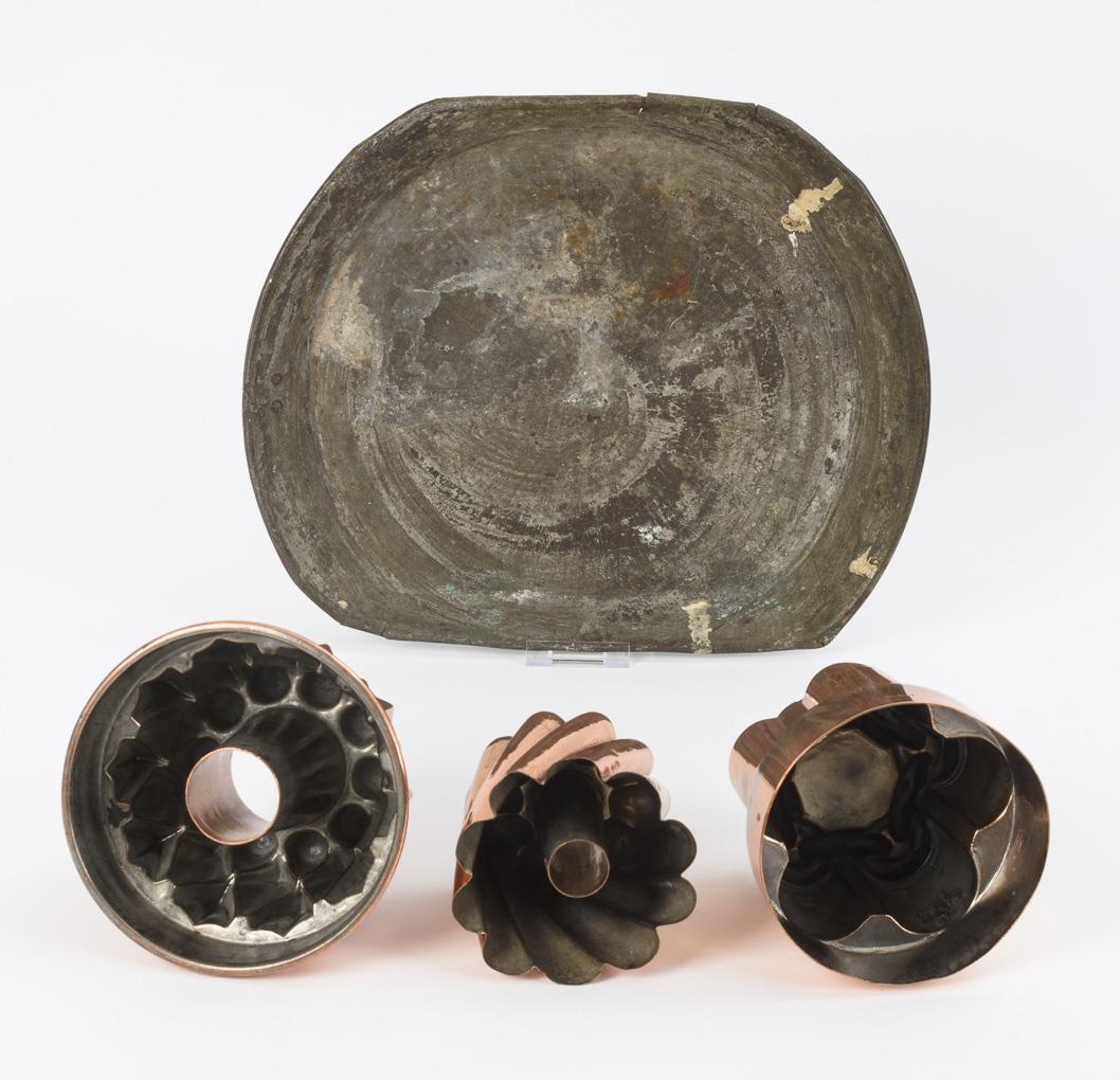 Flat pan with 2 straight edges and star pattern punched on the bottom and hanging eyelet. 3 relief baking molds, 2 of which with chimney. Wall cracks on the tub and strong signs of age/use. Smallest mold slightly dented.