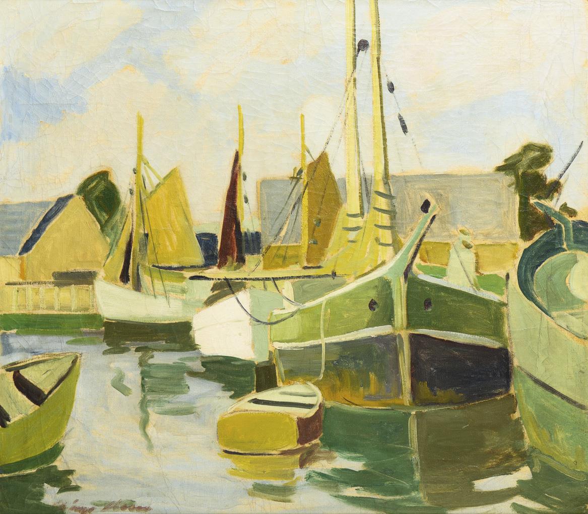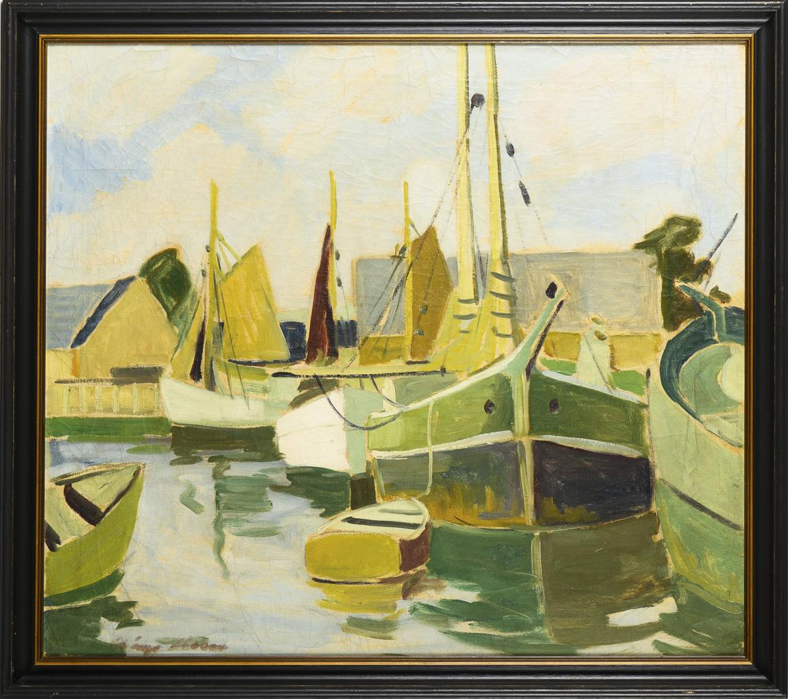 Many sailors in the morning sunshine at the moorings in the harbor. Slight signs of age.