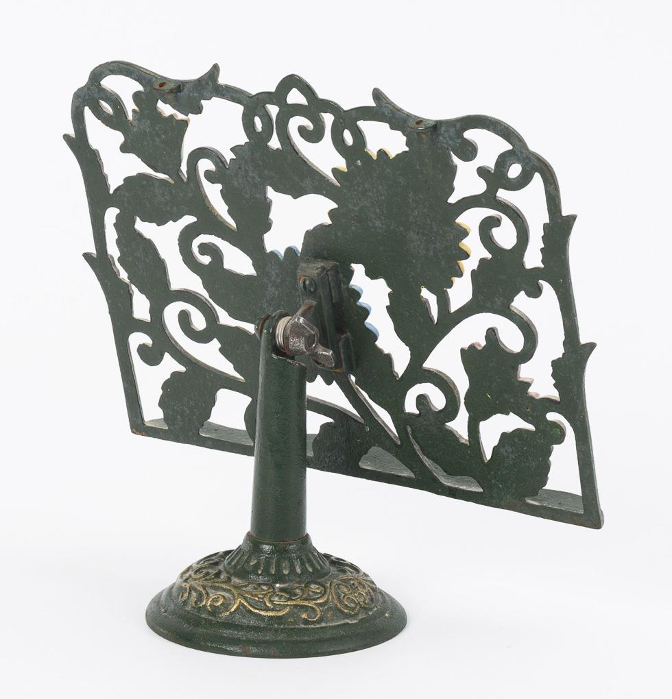 Ornamented round base, from flowers designed rotating book holder. Attachment missing, screws partly supplemented.