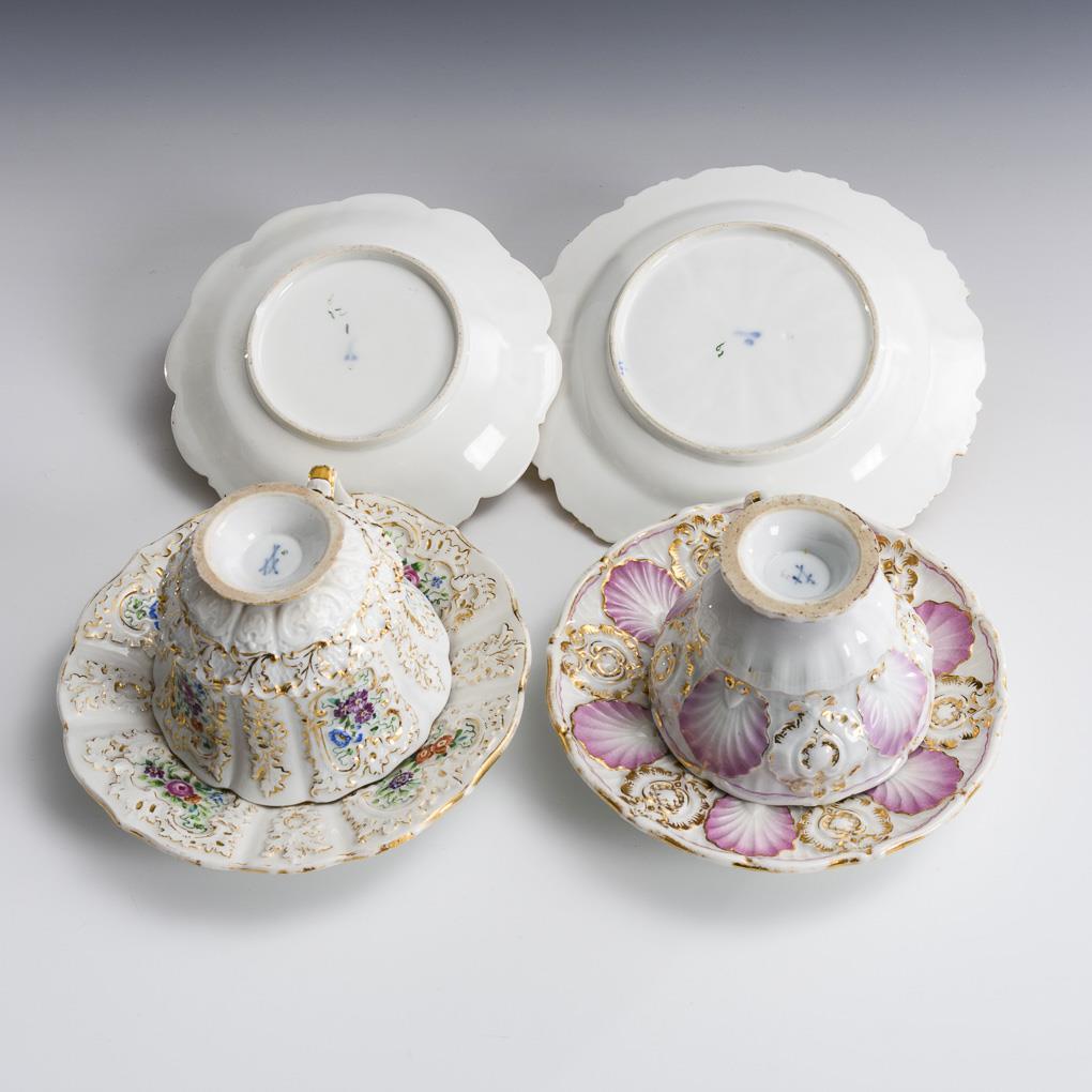 1x cup and saucer with shell and rocaille relief. / 1x cup and saucer leaf and flower relief. / 1 saucer and 1 plate with vegetal relief. Gold rubbed, cup handle glued.