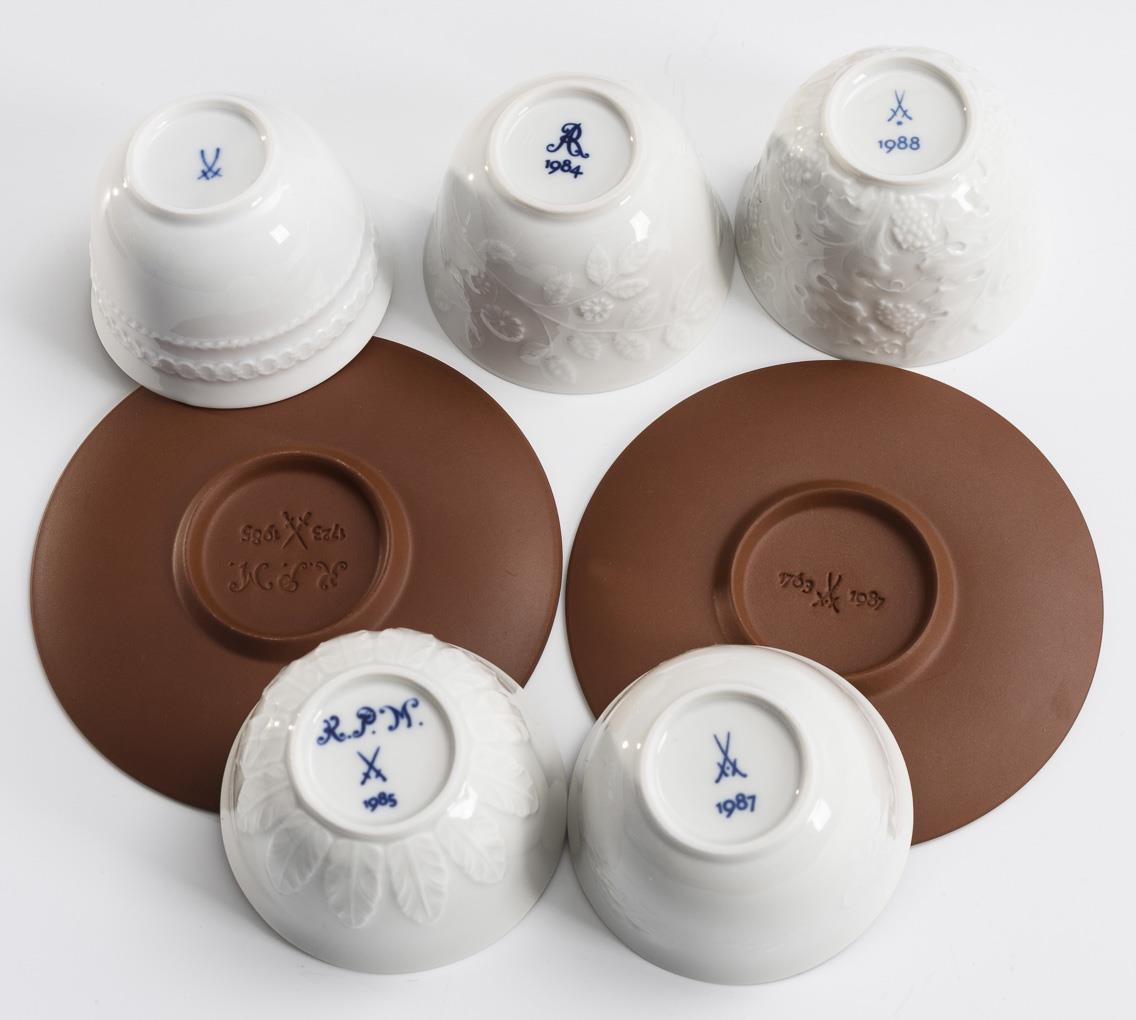 Böttger stoneware and porcelain, white glazed. 5 chummies (h 4,5 cm) and 5 saucers (Ø 11 cm).