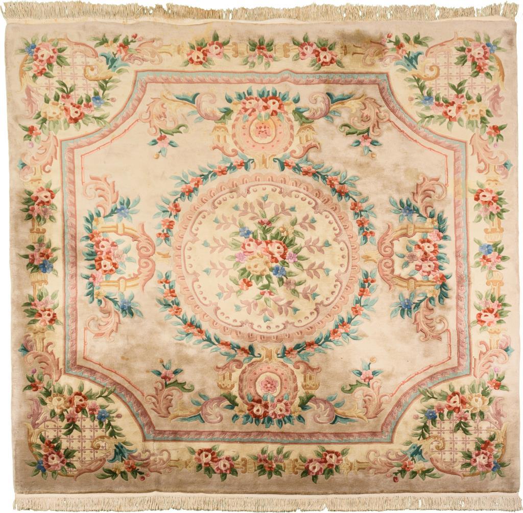 Wolle, wohl chinesische "close-back"-Knüpfung. Polychromdekor in zarten Pastelltönen.265 x 265 cm.