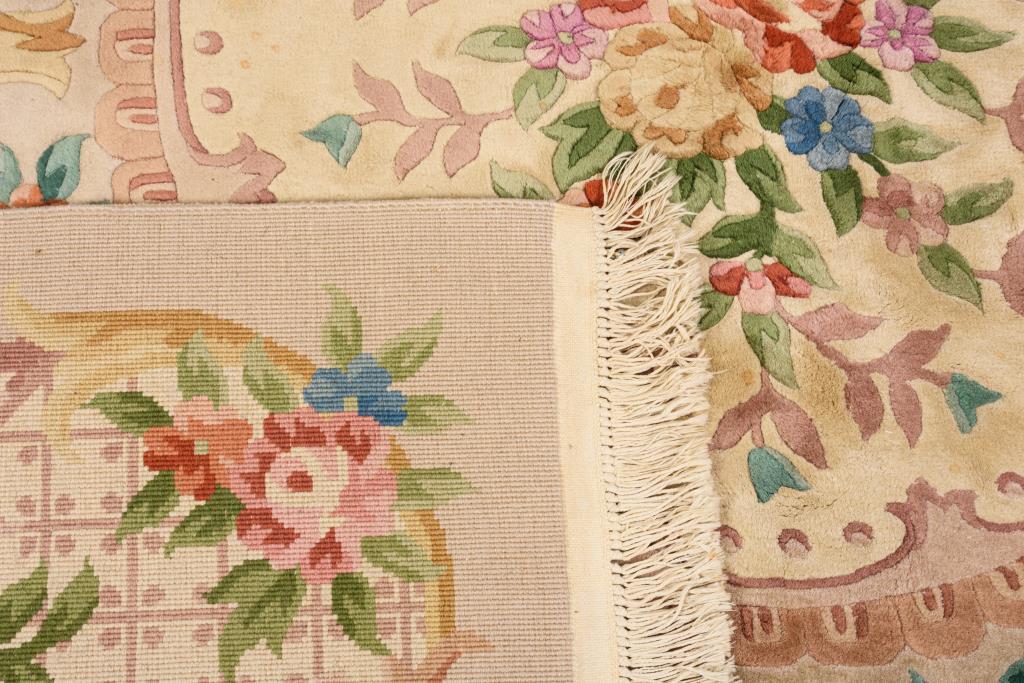 Französischer Musterstil mit zentraler Rosette, begleitenden Blumenkränzen, gerolltem Blattwerk und dezentem Gitterwerk in den Ecken. Reinigungsbedürftig.