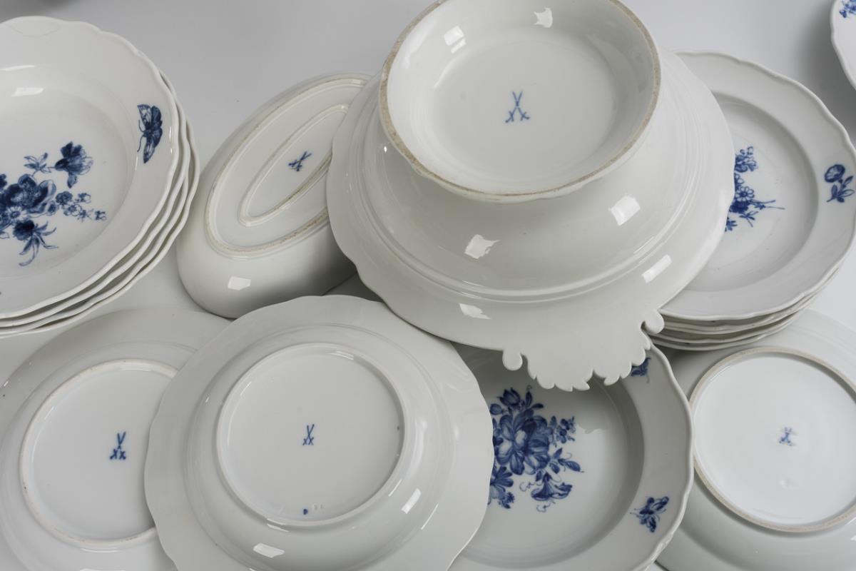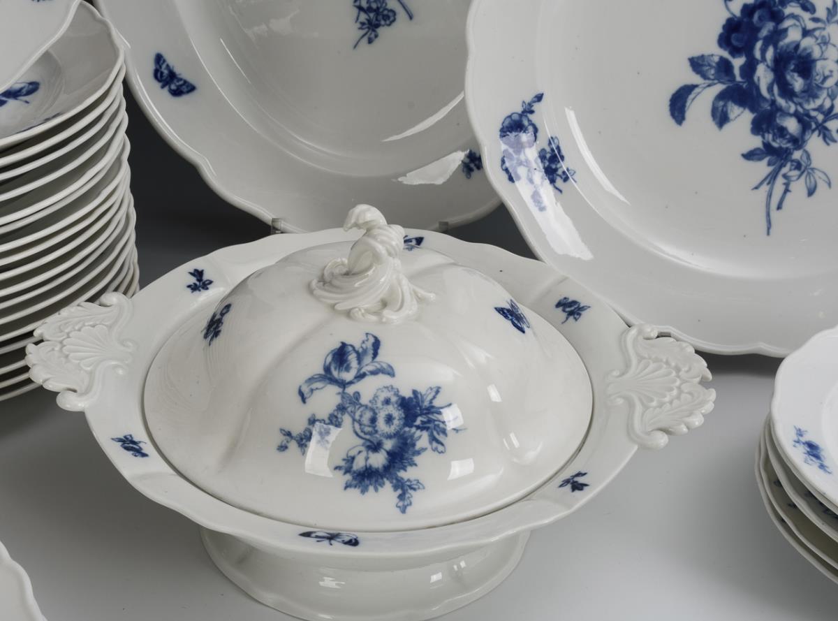 38 pieces. Form "New Cutout". 18 dinner plates, 5 soup plates, 10 salad plates (including 4 deep salad plates, these 2nd H. 20th century), 1 oval plate (L 48.5 cm), 1 vegetable plate (Ø 34.5 cm), 1 oval bowl (L 22 cm), 1 sauce boat and 1 lidded bowl (Ø 33 cm).