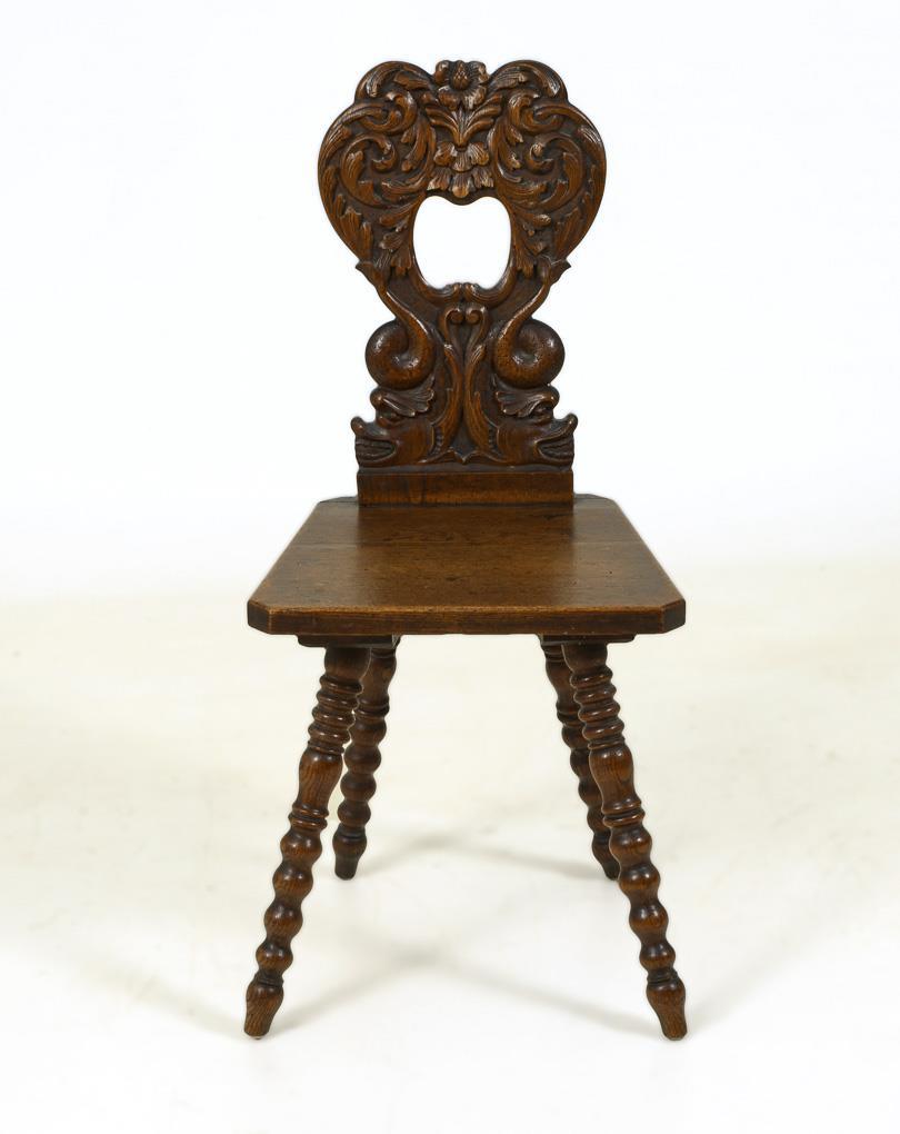 Board chair with trapezoidal seat, lushly carved backrest in the form of mirrored grotesques and acanthus leaf tendrils, on 4 turned legs. Note in pencil on the bottom "W. Bohde Altenburg Piererstr. 28" . Signs of age/use, repaired.