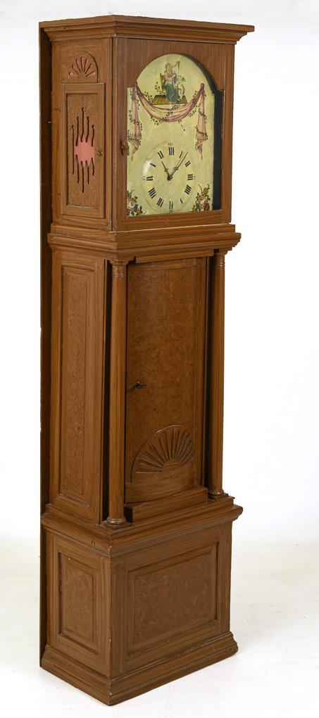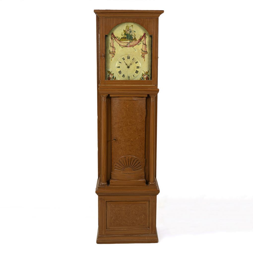 Straight floor standing clock in Biedermeier style with lateral round columns and carved shell motif. Deficient hand position, dial heavily retouched.