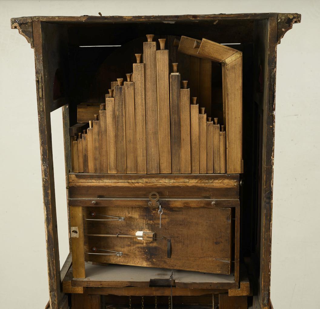 Crank, 3 weights, pendulum, metal chains, rope, 1 case key. Flute clocks form a symbiosis of timekeeping and music playing and testify to great craftsmanship. On the hour, the flute clock first strikes a bell or tone spring and then triggers the built-in organ movement. First, air is pumped into a bellows, which drives the music roll and is scanned by the keyboard. Various pipes are made to sound. The late 18th century can be considered the heyday of flute clocks. Especially Viennese flute clocks became a sought-after export article. Simpler flute clocks from the Black Forest were produced until the middle of the 19th century.