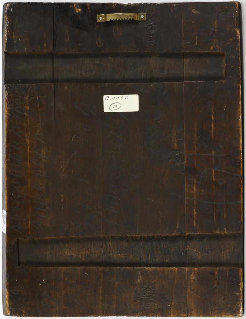 Mary with the image of Jesus in front of the chest. Misses on the edges, signs of age.