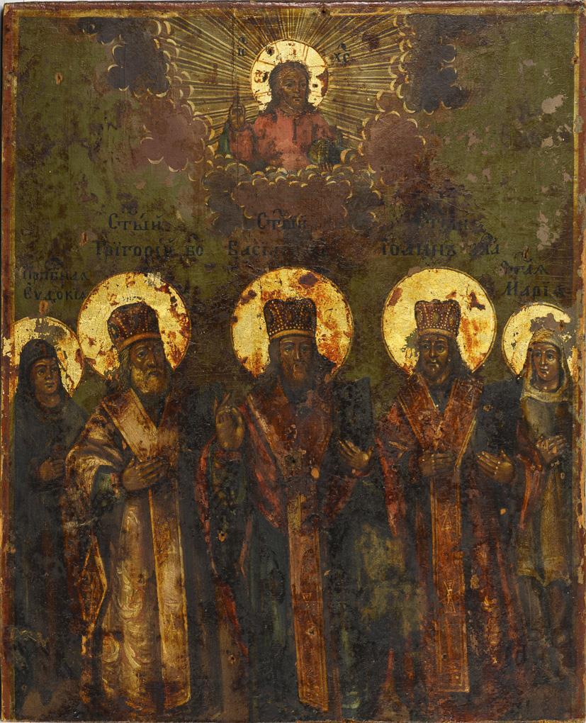 Five saints under a cloud hummel with the blessing Christ. Holes, paint chips.