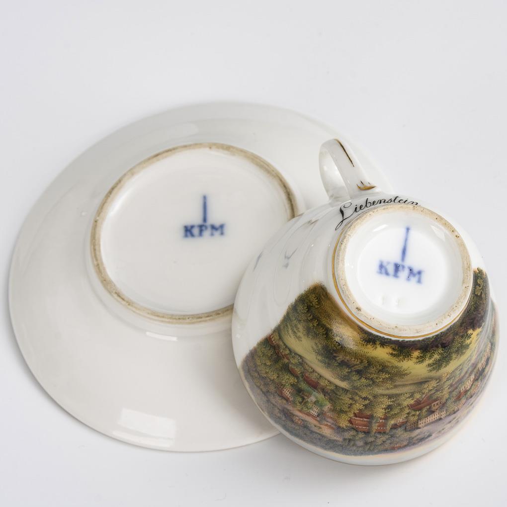 Bell cup with ear handle. On the front side the verso inscribed view of Bad Liebenstein, in the mirror of the saucer the inscription "J. Georg Fröber. 1863". Minimal gold abrasion on the rim of the cup.