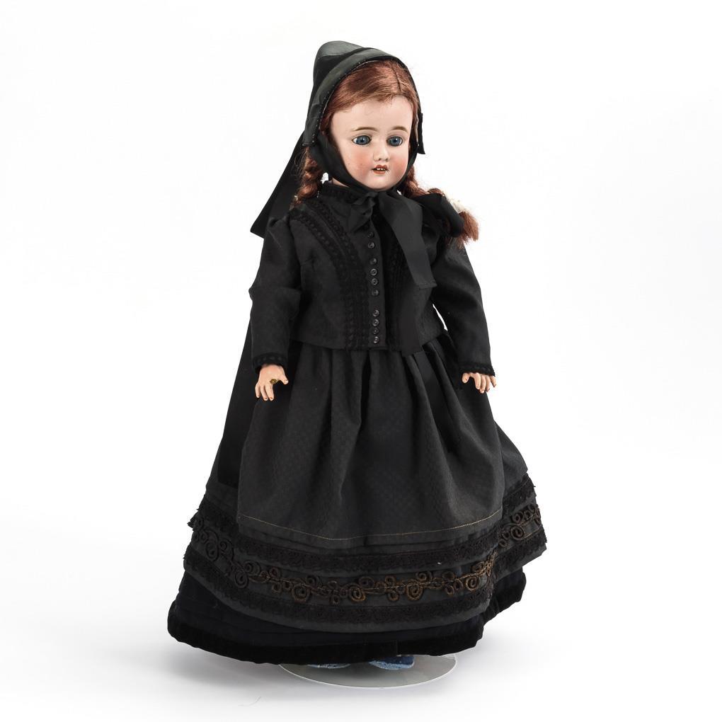 Porcelain head doll in black costume. Schoenau & Hoffmeister.