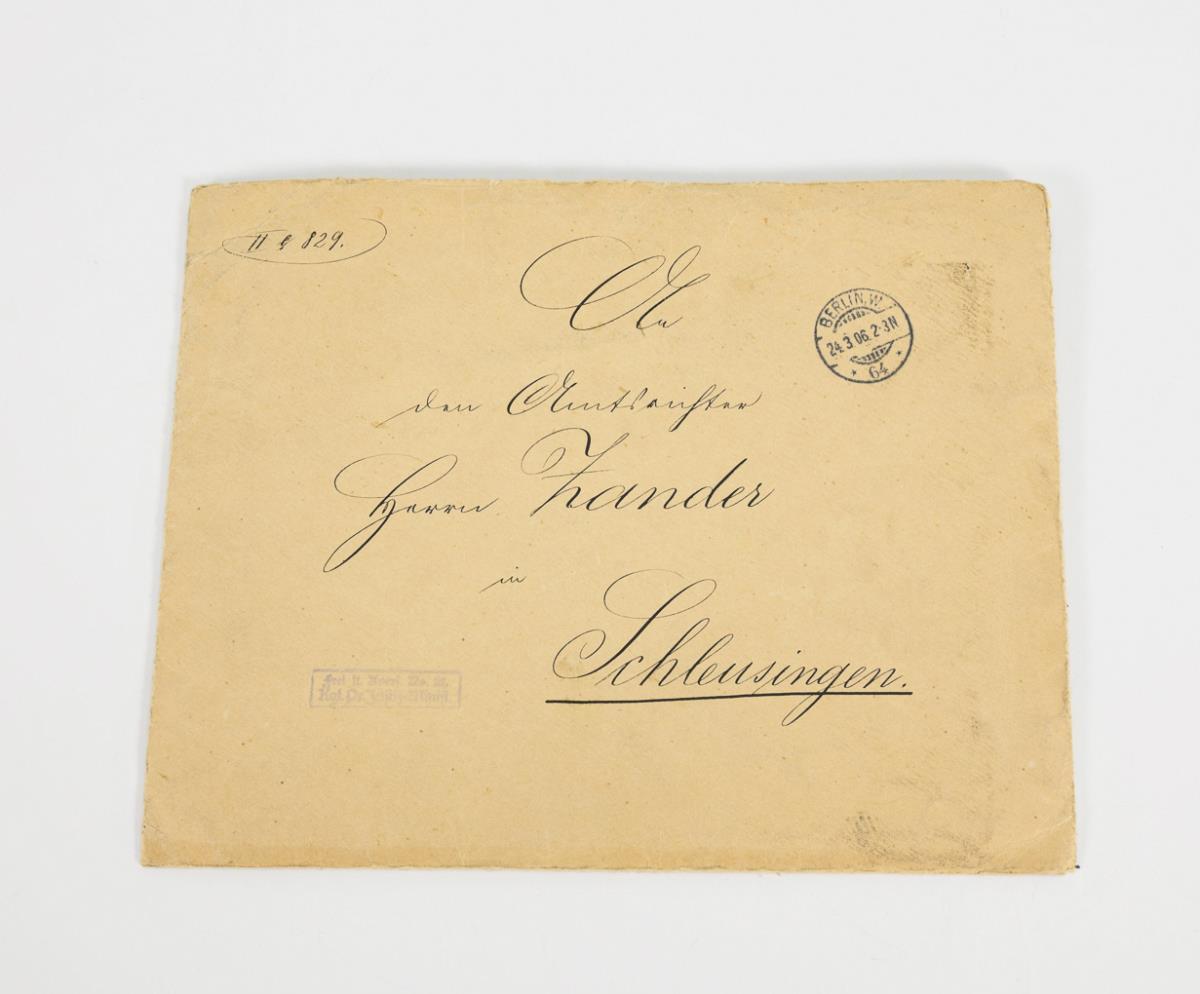 In the preserved envelope certificate of appointment dated 17. 3 1906 for the district judge Kurt Zander in Schleusingen with appointment to the district court council. Signature manu propria of Emperor Wilhelm II with blind seal as well as countersignature manu propria of the Minister of Justice Max von Beseler. In addition, cover letter from the Minister of Justice to the district court judge with indistinct signature in the order. Enclosed 2 postcards: war postcard (field postcard) with the portrait of Wilhelm II (described and used 1915) and photo postcard "Our Hindenburg", recto probably autograph with motto, signature and date 30.7.1917. A few traces of age / use only on the envelope.