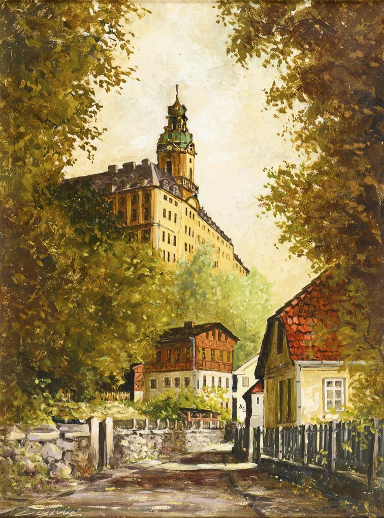 View along the road with the castle under gray sky | Supplement 5.6.2023: The painter is Hans-Jörg Egidy (1916 - 2006).