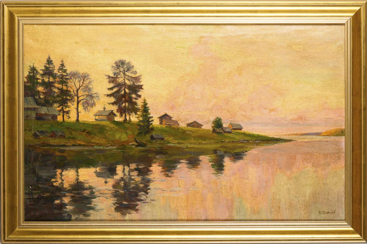 Houses on the shore in the evening light under a slightly cloudy sky. Minimal signs of age.