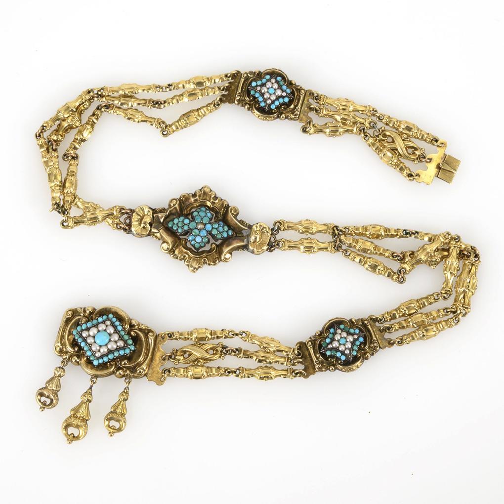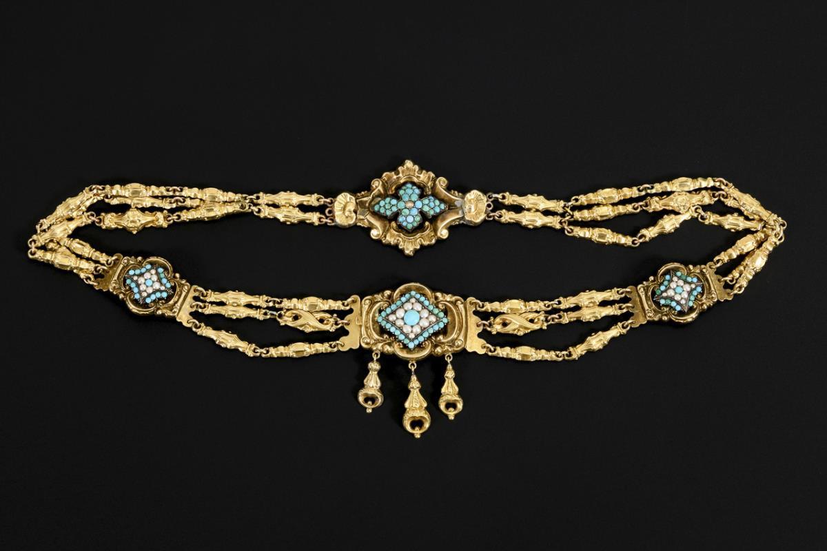 4 hollow-worked relief links, set with turquoise cabochons and half pearls, between relief link chains. Ornamental box lock with suspensions. Rear 2 repair spots for reinforcement.