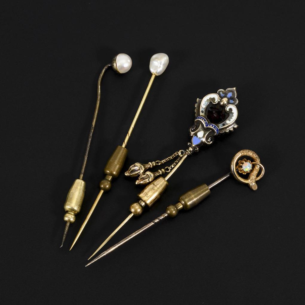 Relief pin head with enamel and claw set color stone. 2 pearl pin heads and snake with opal cabochon. Long needles with metal slides.