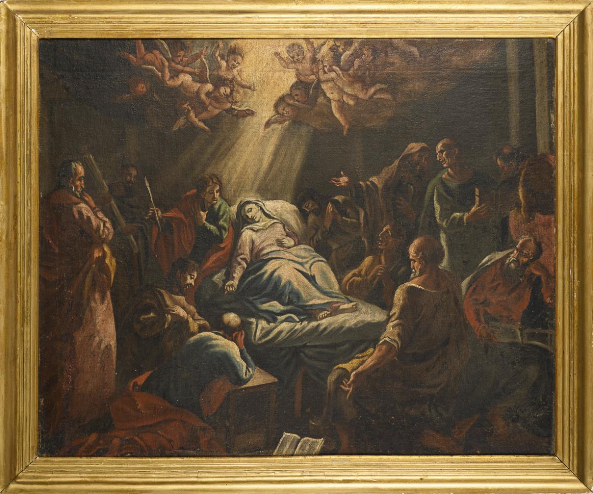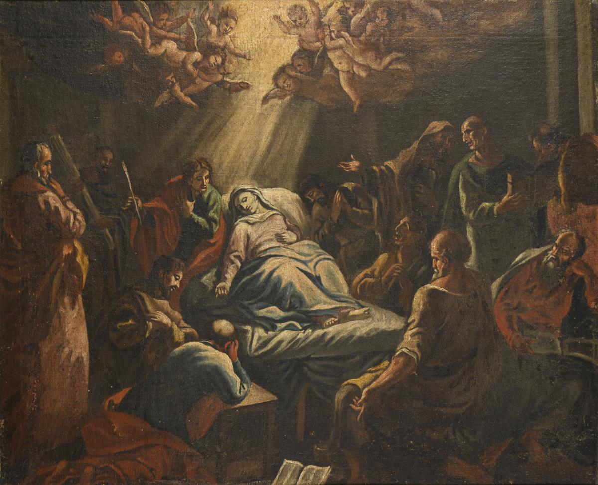 The Mother of God surrounded by the twelve mourning apostles, while the divine light accompanied by putti shines on them. Canvas doubled, traces of age.