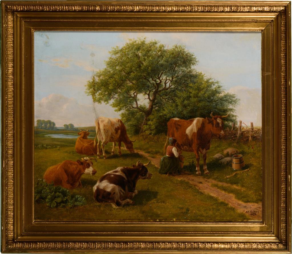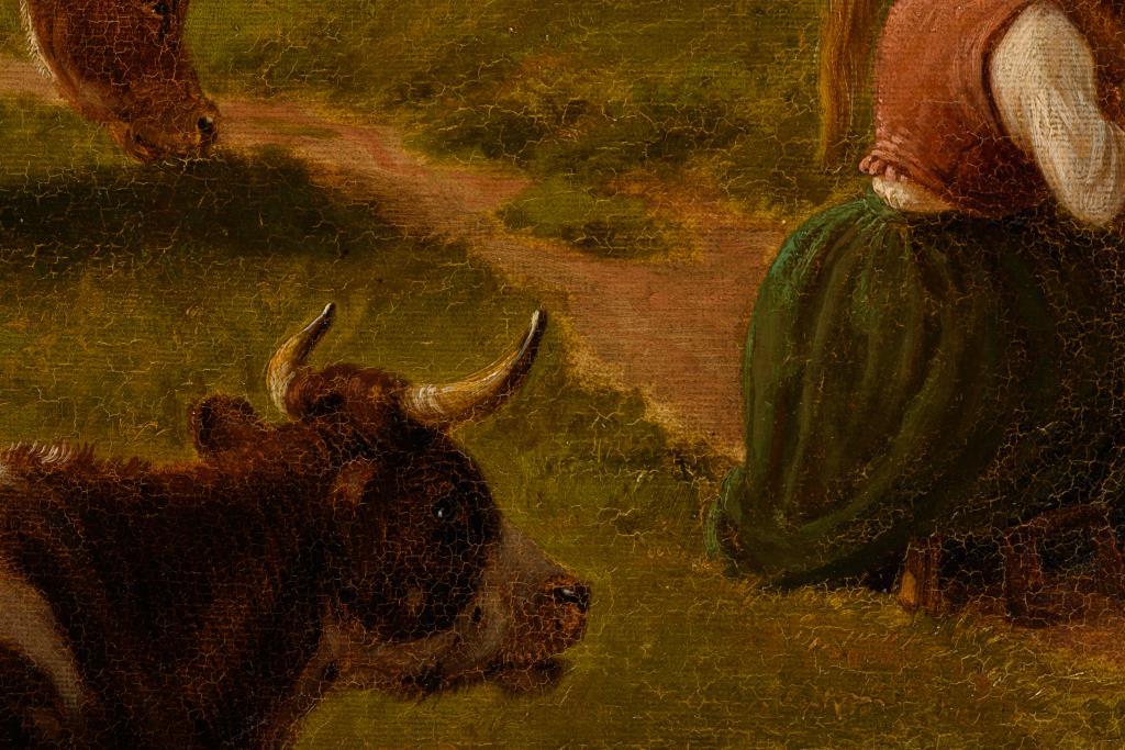 Die Tiere im Sonnenschein nahe einem See und der Magd beim Melken. Eine restaurierte Stelle.
