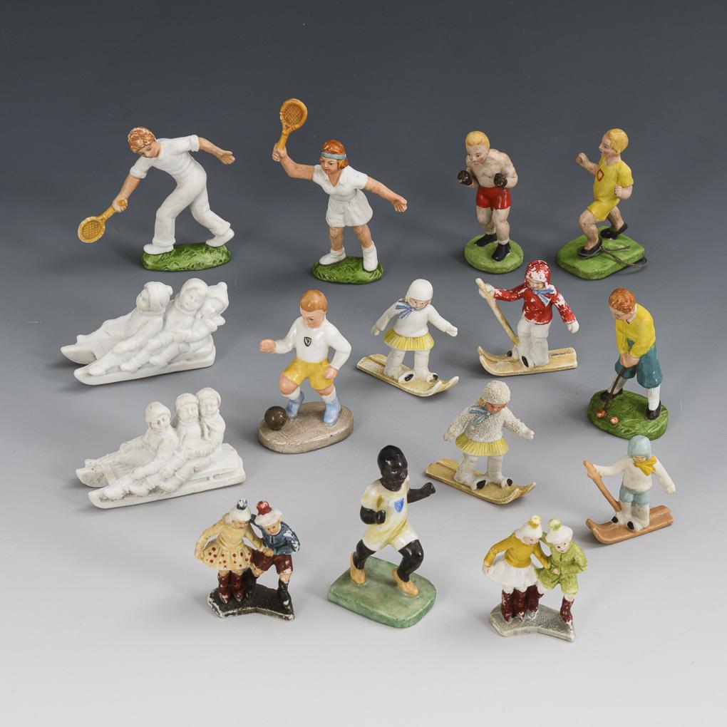 Miniature athlete figures: including black runner, probably Jesse Owens (Olympic champion 1936), boxer, golfer, skier, tennis player and luger. Small defects, some paint abrasion.