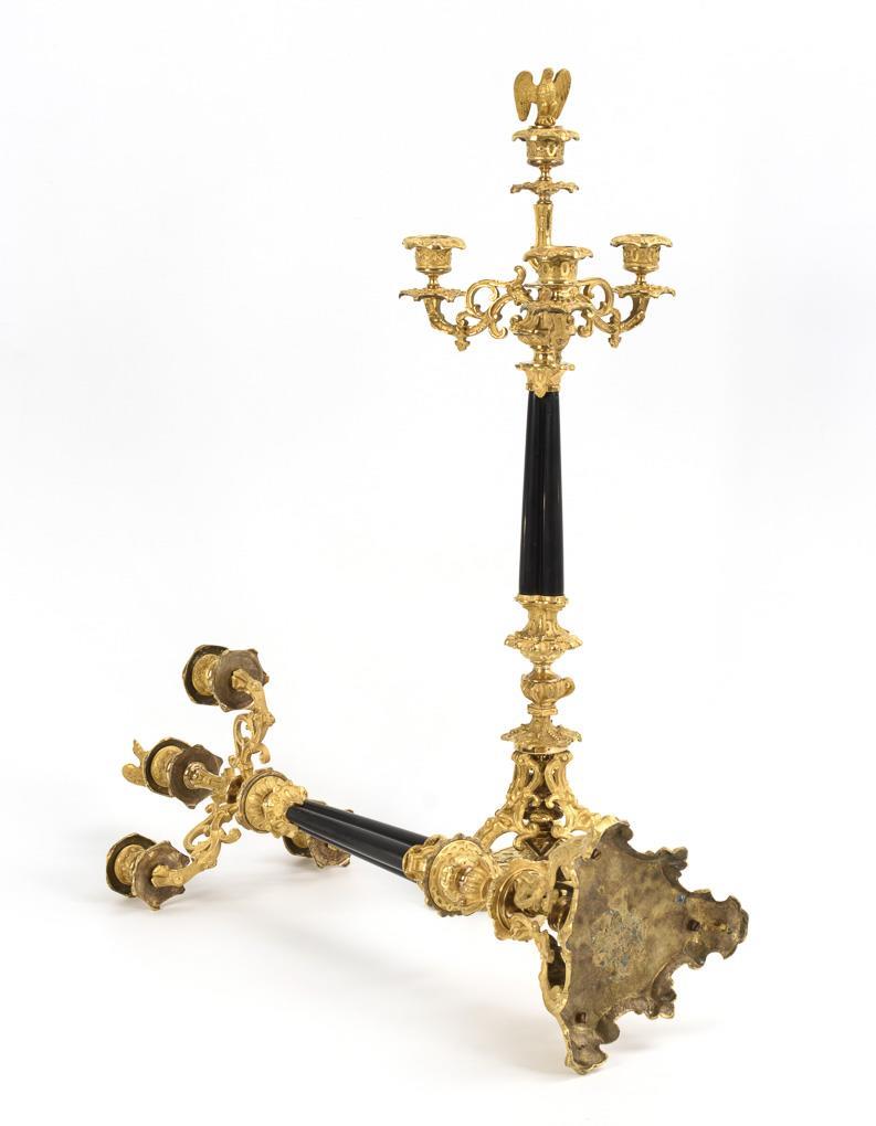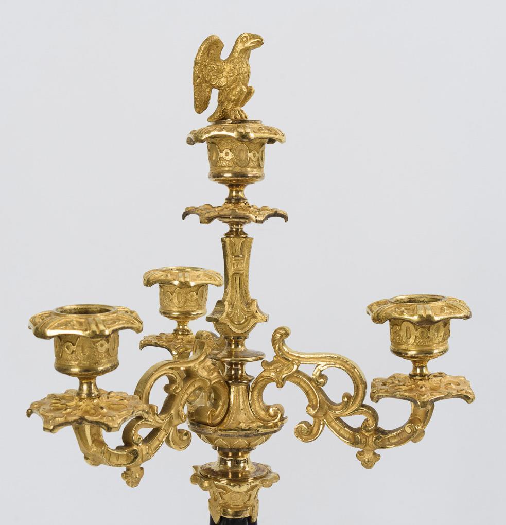 Very elaborately crafted candlestick with exceedingly rich, partly polished Reliefzier on the 3-sided base, vase shaft base and the crown with 3 volute arms as well as Napoleonic eagle figure as a flame extinguisher on the raised central spout. 2 minimal hairline cracks in the bronze, small chips and professional repair on the marble.