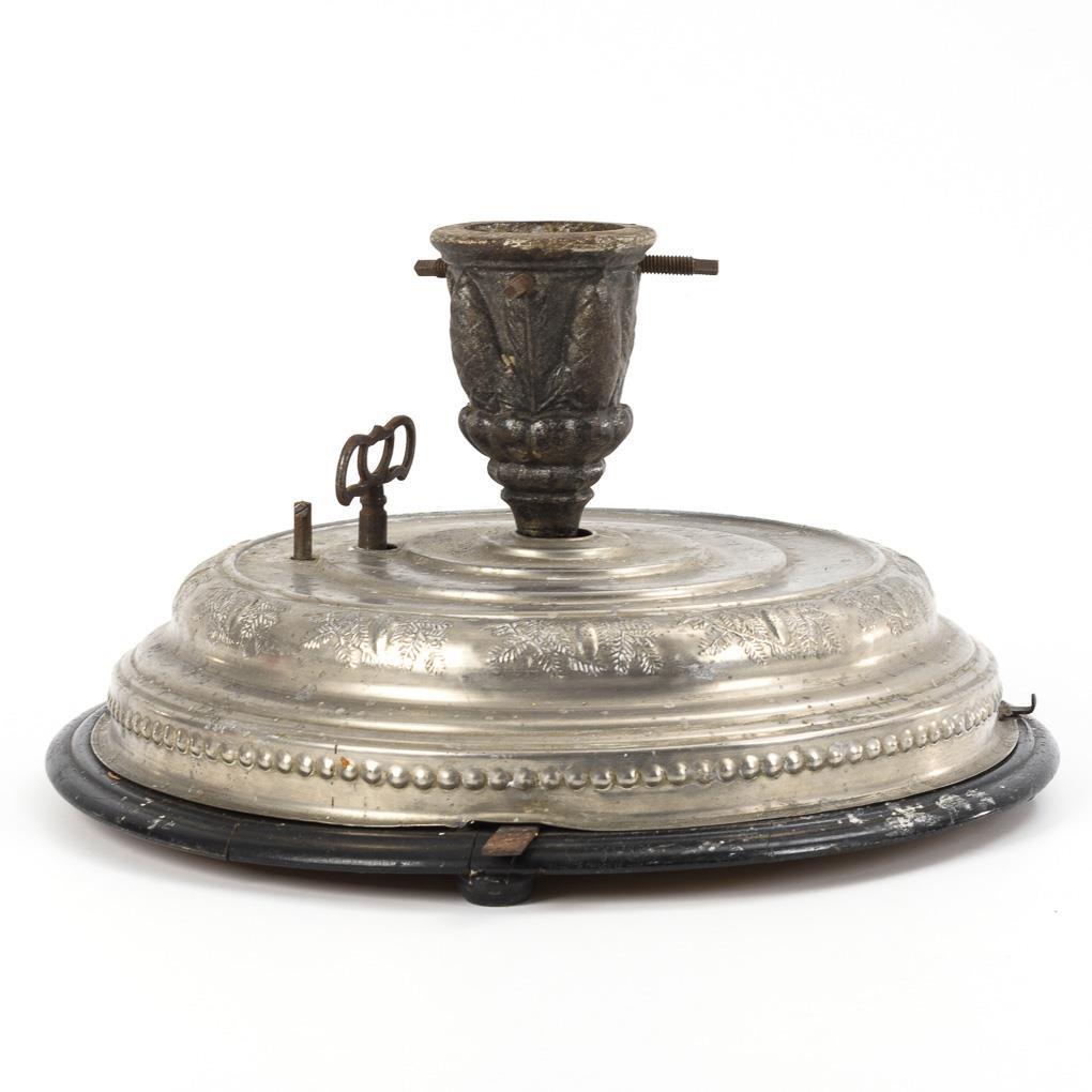 Christmas tree stand with embossing and rotating tree holder with pine cone relief. Switchable musical mechanism with a total of 4 songs as well as carillon (4 bells). Running, in need of restoration.