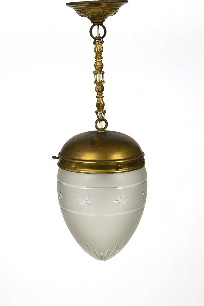 1-light ceiling lamp on chain suspension with palmette canopy and bowl-shaped holder; oval lampshade. Metal with traces of corrosion, glass rim with minimal chips.