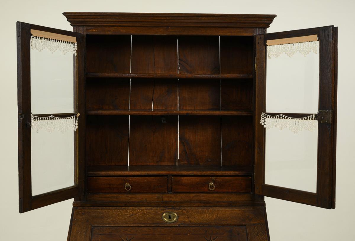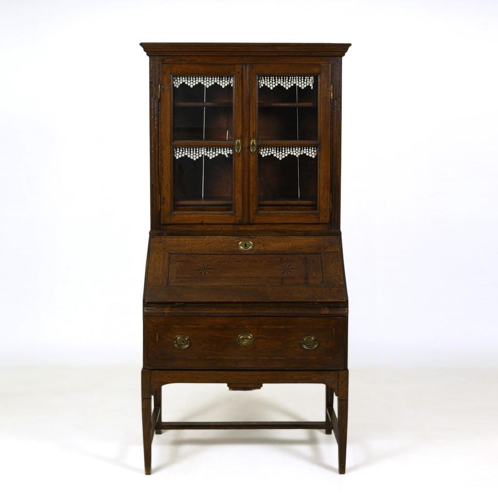 Simple display cabinet top secretary with 1-bay base on braced pillar legs, writing cabinet with slanted writing flap and 2 pull-out support strips and 2-door top with front glazing, decorated with fluted side strips, small star inlays and antique brass fittings; writing cabinet inside with 1 open compartment and 7 drawers, top with 2 shelves and 2 small drawers. Traces of age / use, restored with additions.