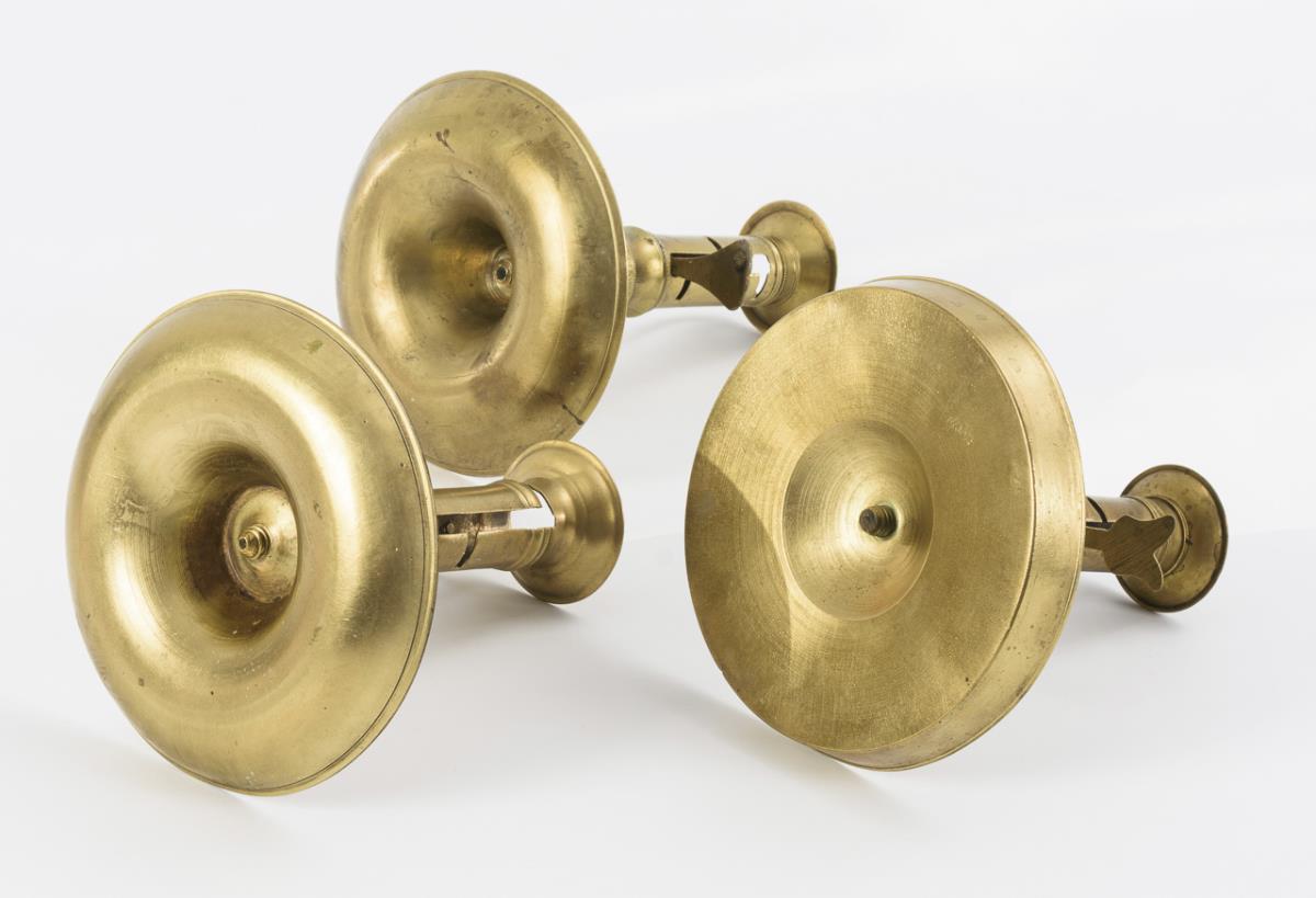 Candle holder with bowl feet, carrying handles and height adjustment. 1 thread overturned, few signs of age/use.
