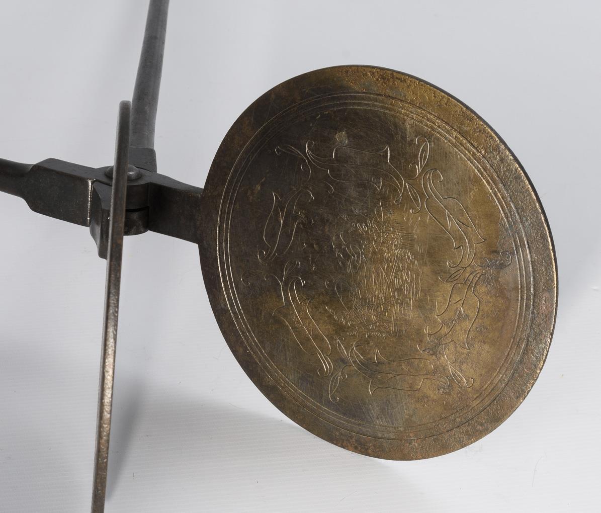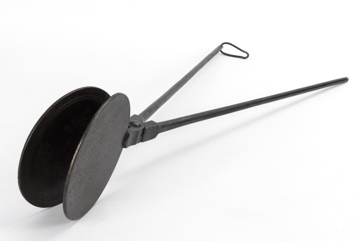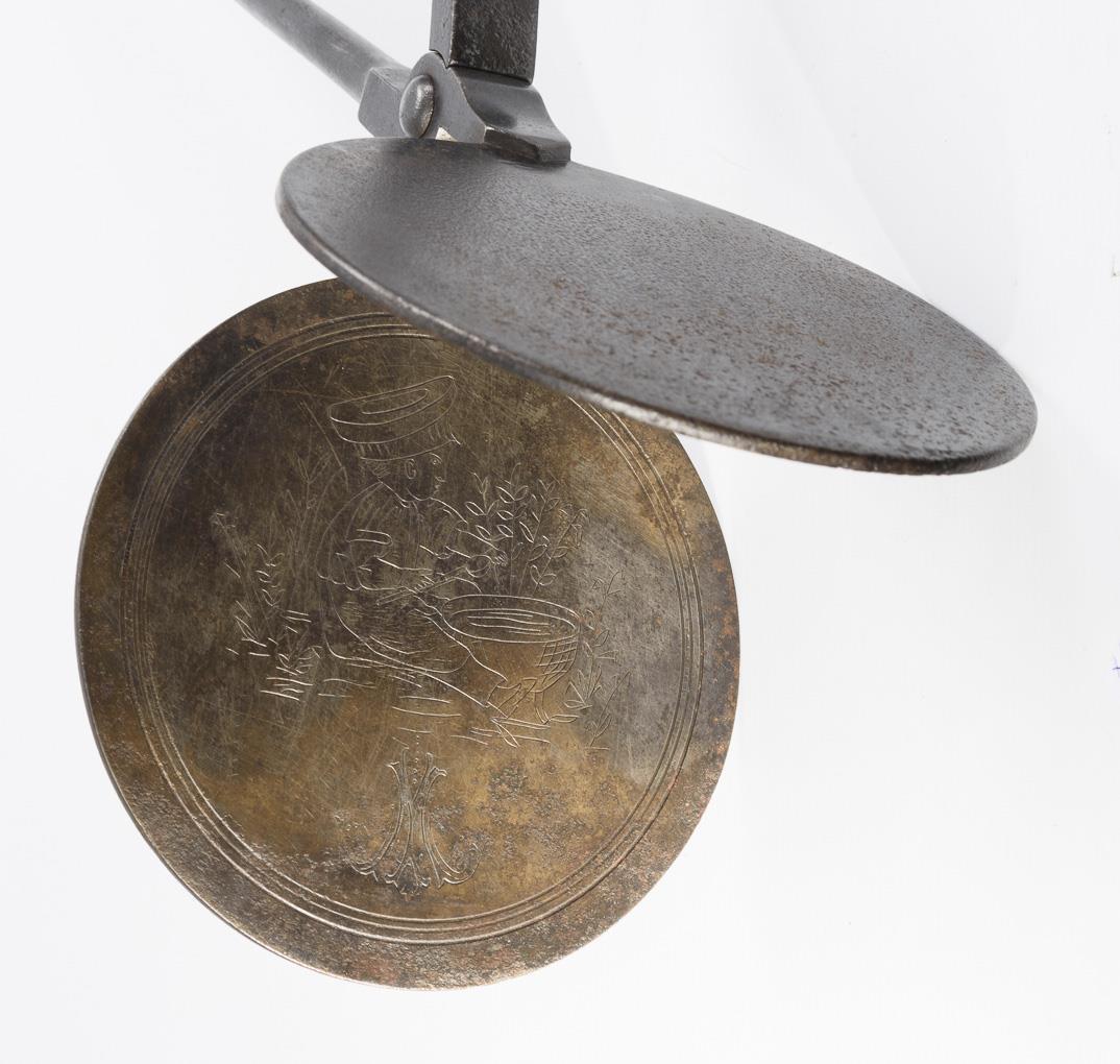 Tongs with locking lever and round "waffle iron": little baker boy with bowl and spoon / dwarf and stork in leaf wreath.