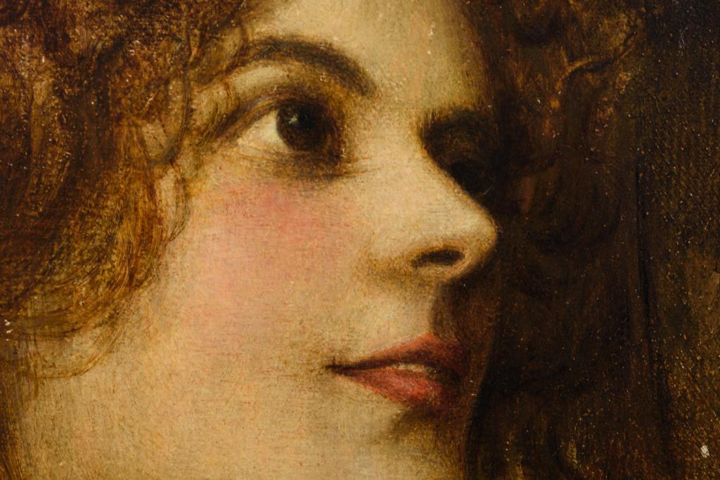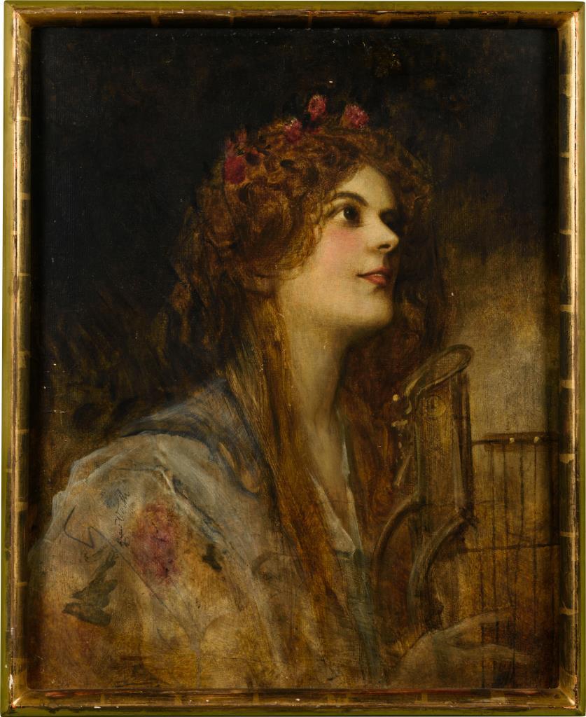 Junge Frau mit freudig nach oben gerichtetem Blick beim Spielen des Instruments. Leichte Altersspuren.