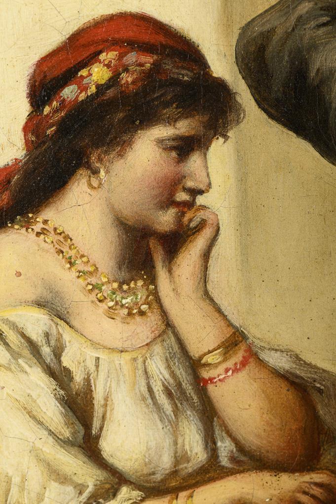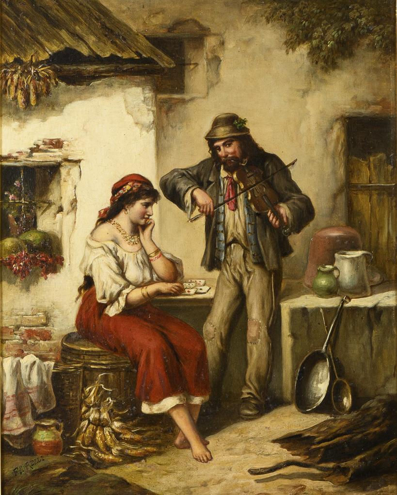 Young man in poor clothes playing music in front of a young woman with cards on a ledge in front of the house. Canvas edge-doubled.