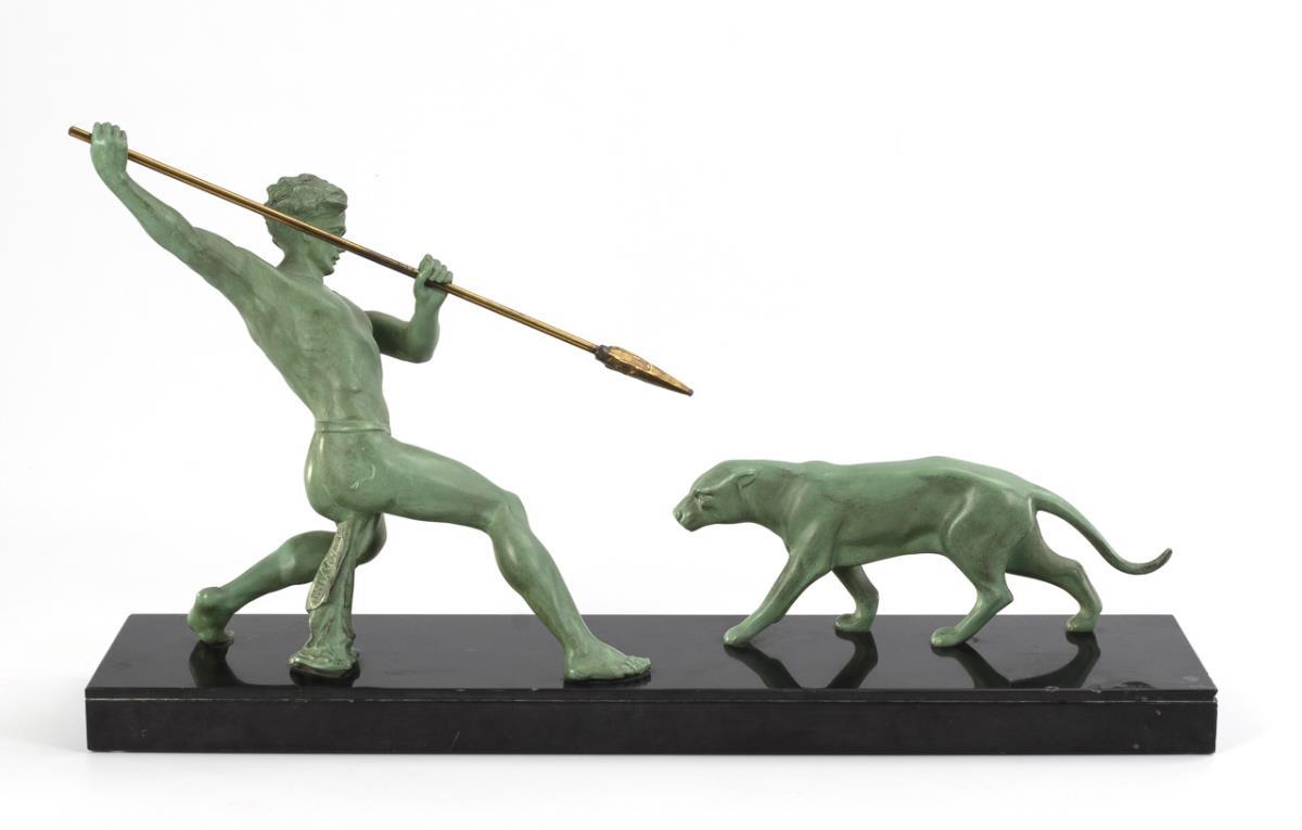 Nude of a young man fighting the panther in the extreme lunge with the lance. Small chips on the plinth, minor signs of age/use on the spear.