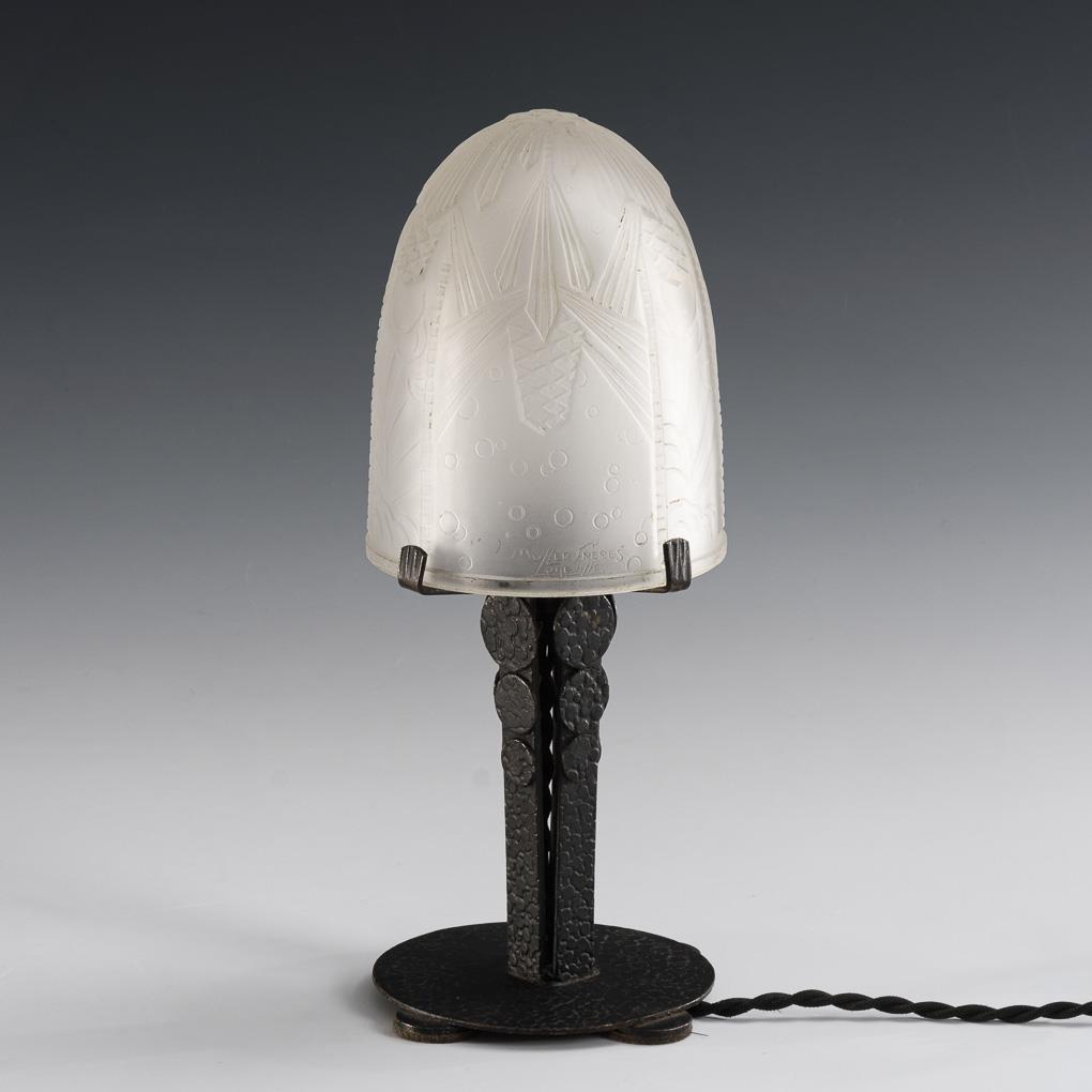 Art deco table lamp with signed glass shade.