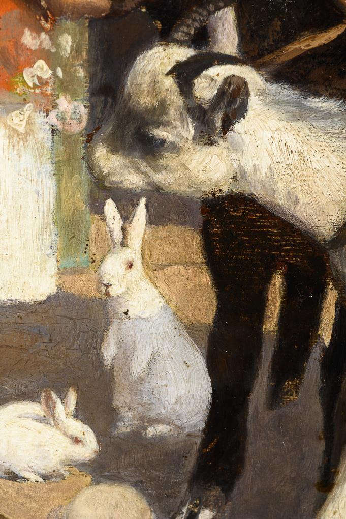 Idyllic scene with little girl between many rabbits, birds and two goats. Minimal signs of age.