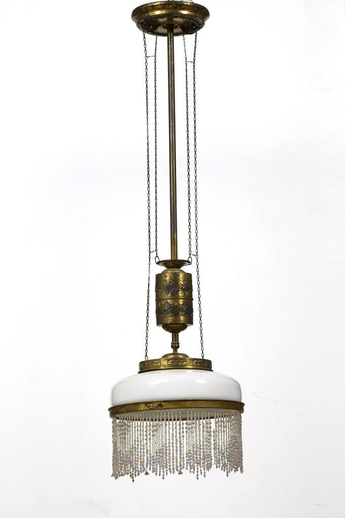 1-light hanging lamp on central strut with plate canopy, height adjustable by pulley and inserted spigot weight; glass bowl accented by brass ring and transparent glass bead hanging; brass with style-typical relief fornamentation. Traces of age/use, metal with traces of corrosion, glass rim with small chips, 1 bead band missing.