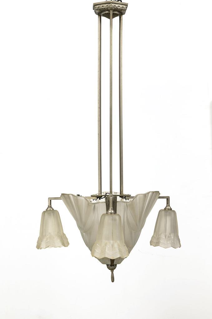 You are here:   Home Categories Lamps and Lighting Hängelampe Art Déco, Degue, 3 Schirme + Schale frarbloses Preßglas