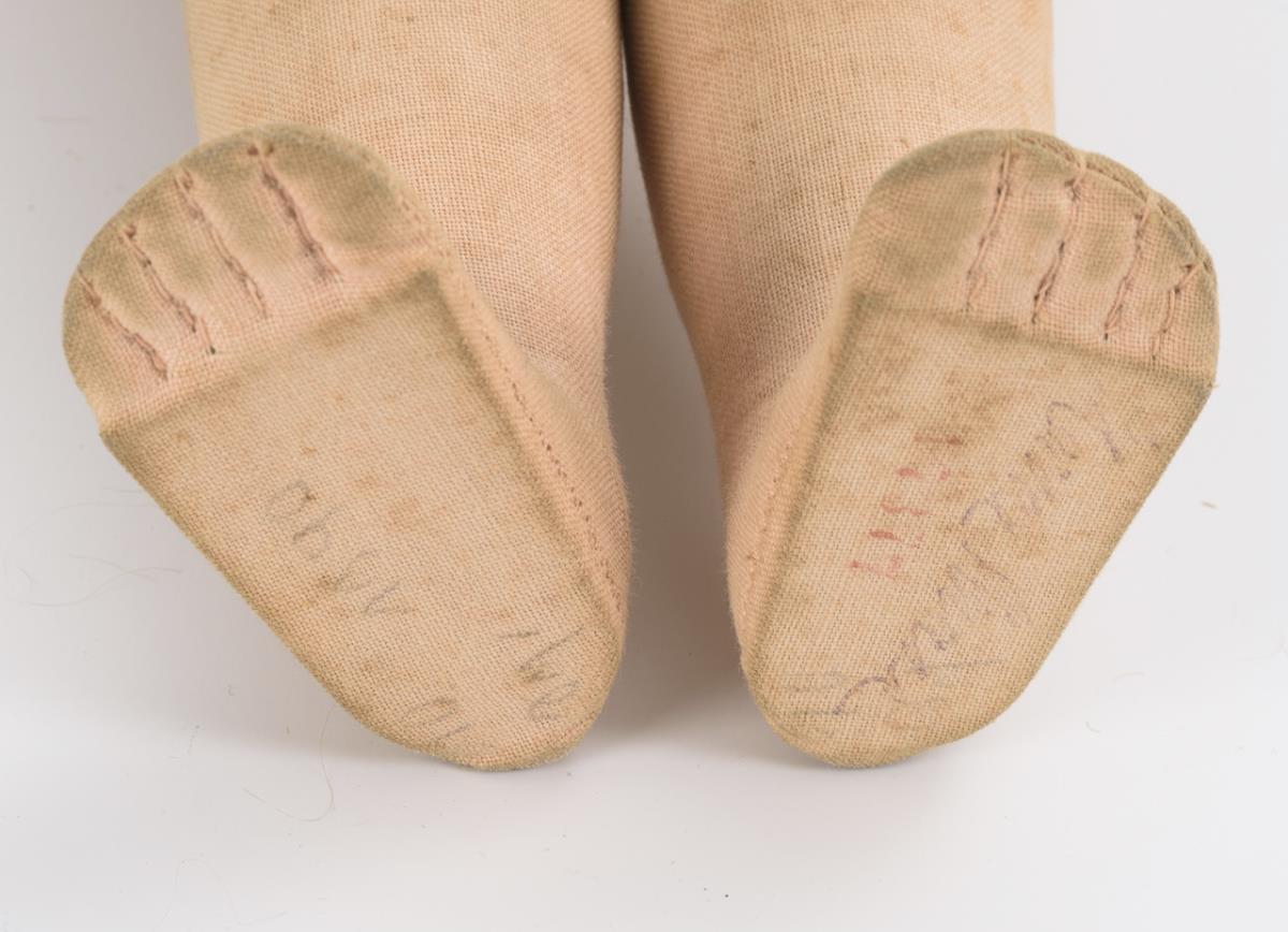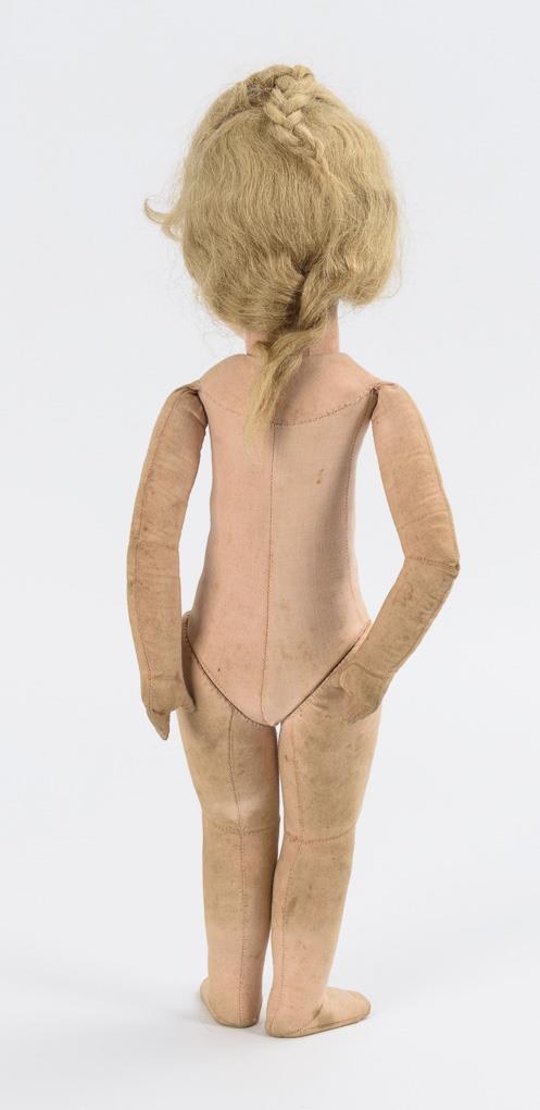 Painted crank head with 1 back head seam and blond real hair wig. Cloth body, rocker arms, legs with disc joints. Blue patterned dress, white apron, brown leather shoes. Body stained.