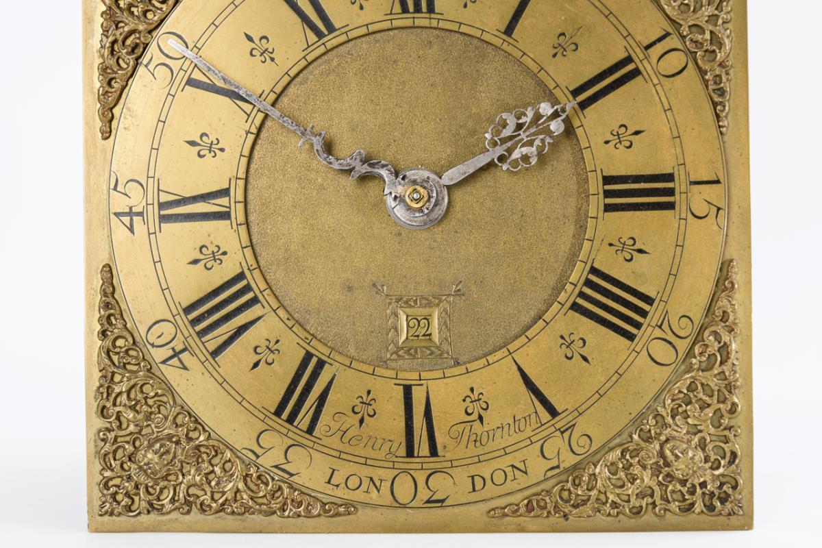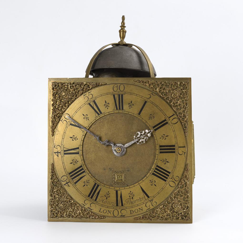 brass wheel movement with Graham gear, quarter hour strike on bell, chime movement (10 hammers on 8 bells), function not tested (according to consignor information functional), revision recommended. Dial ring with Roman hours and Arabic minutes, minute ring and floral iron hands, date display at the 6, marked "Henry Thornton London".