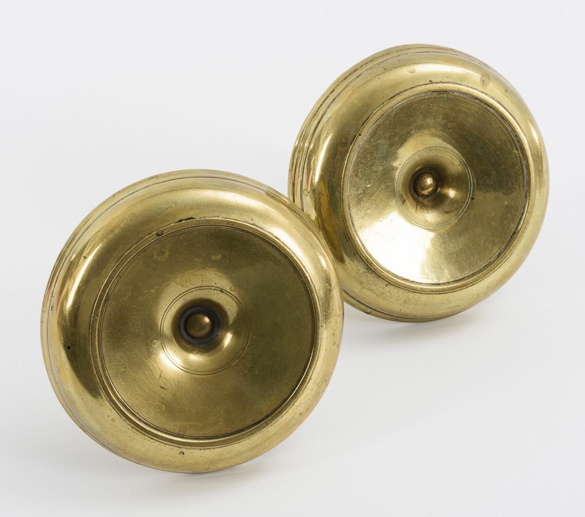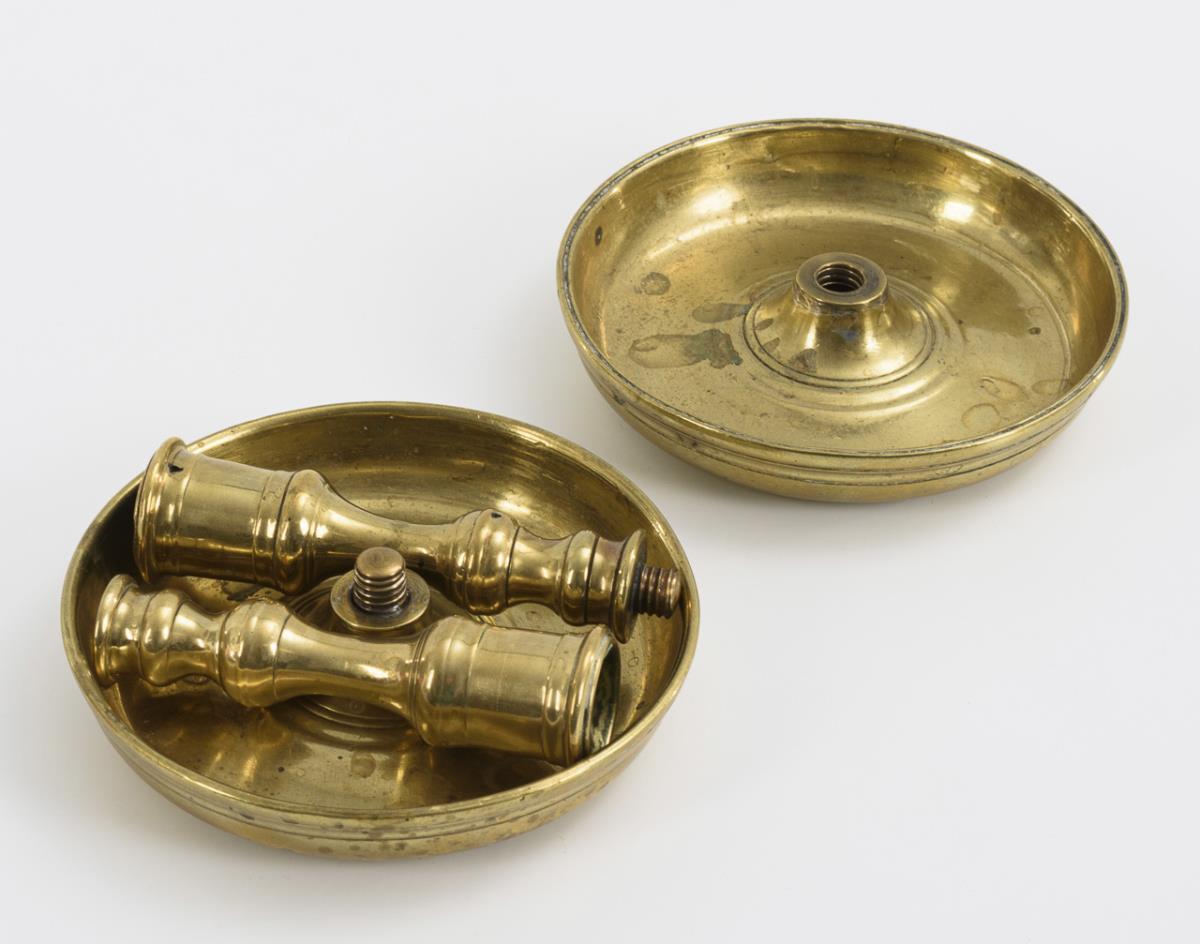 Rare candlesticks with roller grommets, baluster shafts and deeply molded foot bowls, which when screwed together form the transport container. Thread professionally renewed, few signs of age/use.