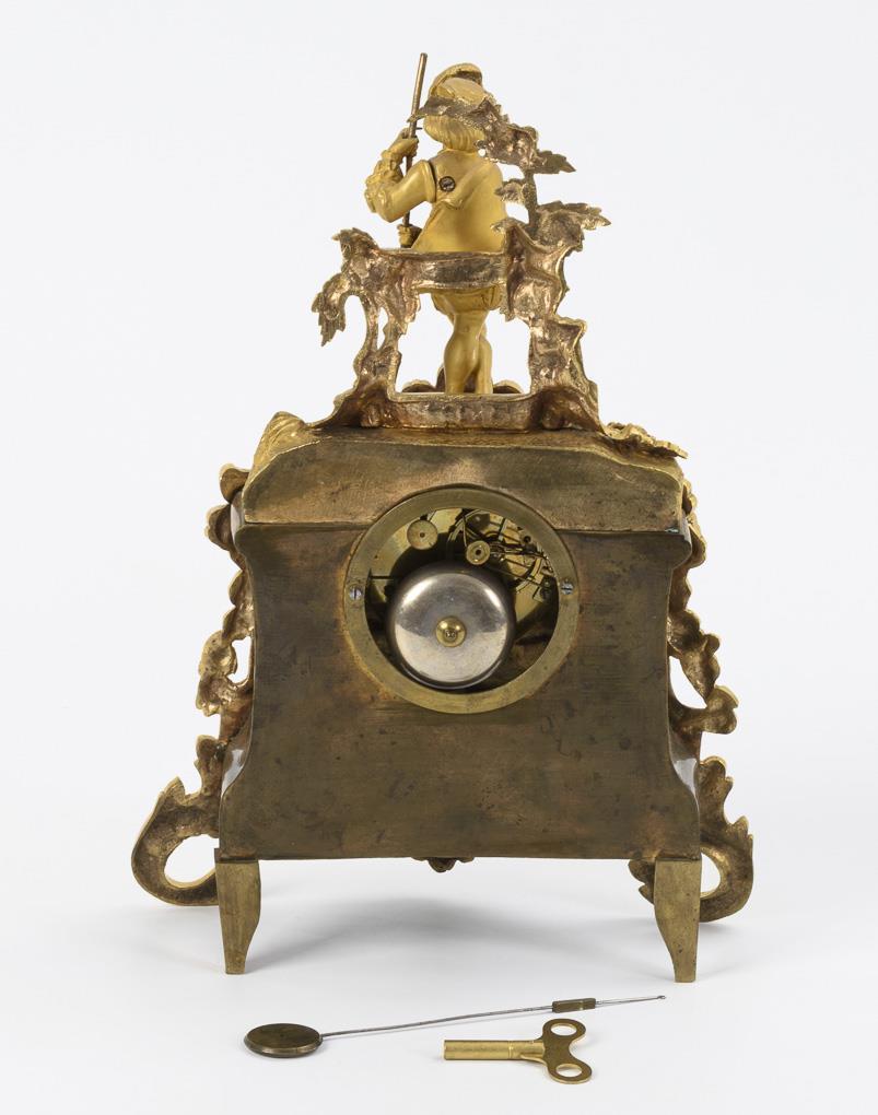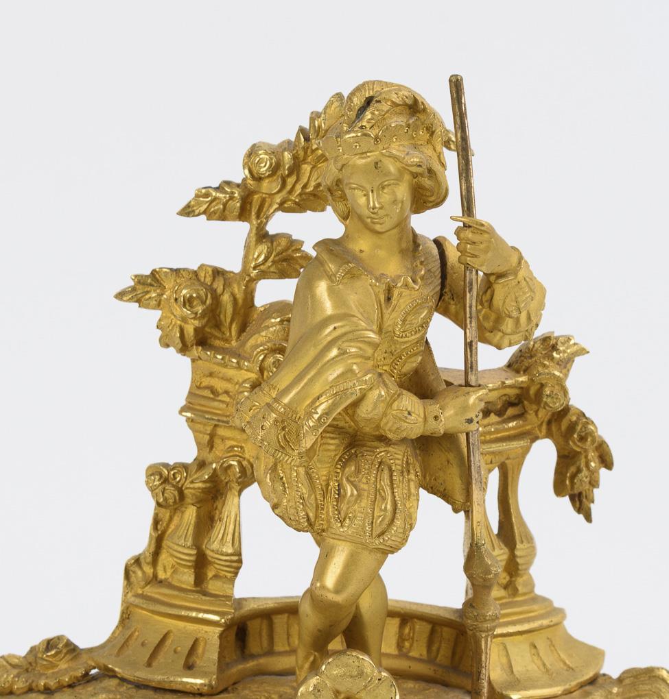 Pompously decorated base with crowning nobleman in historicist garb and with shepherd's crook. Dial slightly hairline cracked, minimal signs of age.