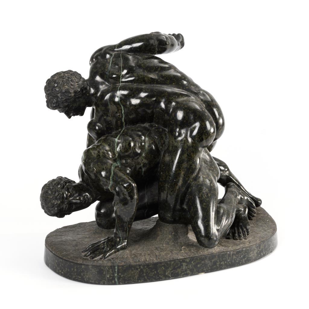 Nach dem antiken Vorbild in den Uffizien/Florenz vollplastisch und detailliert gestaltete Gruppe der kämpfenden Pankratiasten. 1 Arm zweifach geklebt.