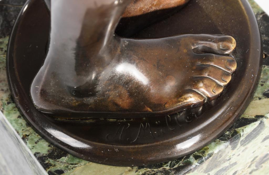 Bronze patiniert, grün/schwarzer Marmor-Sockel.Bezeichnet, undeutliche Gießermarke.H 42,5 / 54 cm.