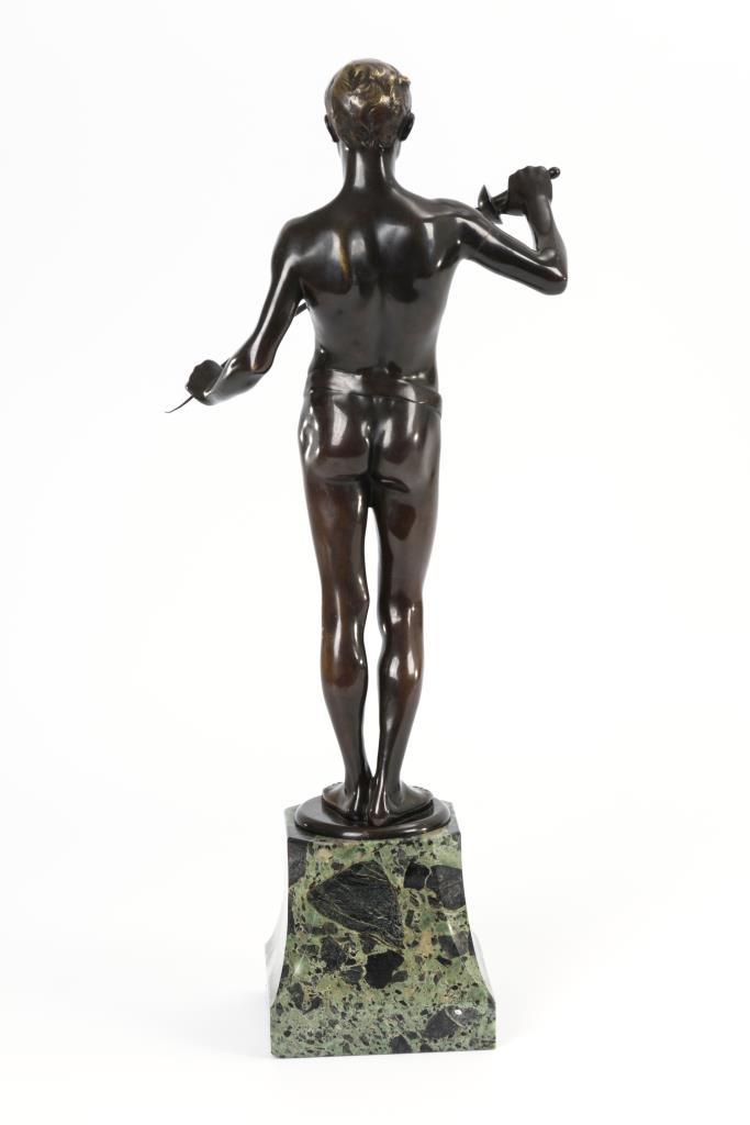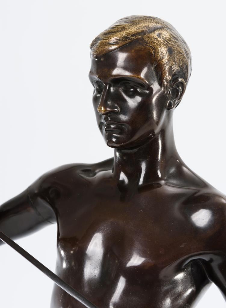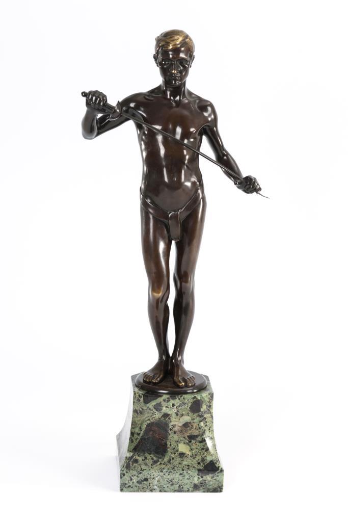 Lediglich mit einem schmalen Hüfttuch bekleideter Jüngling mit Degen. Degenspitze verbogen, Patina teils etwas berieben.