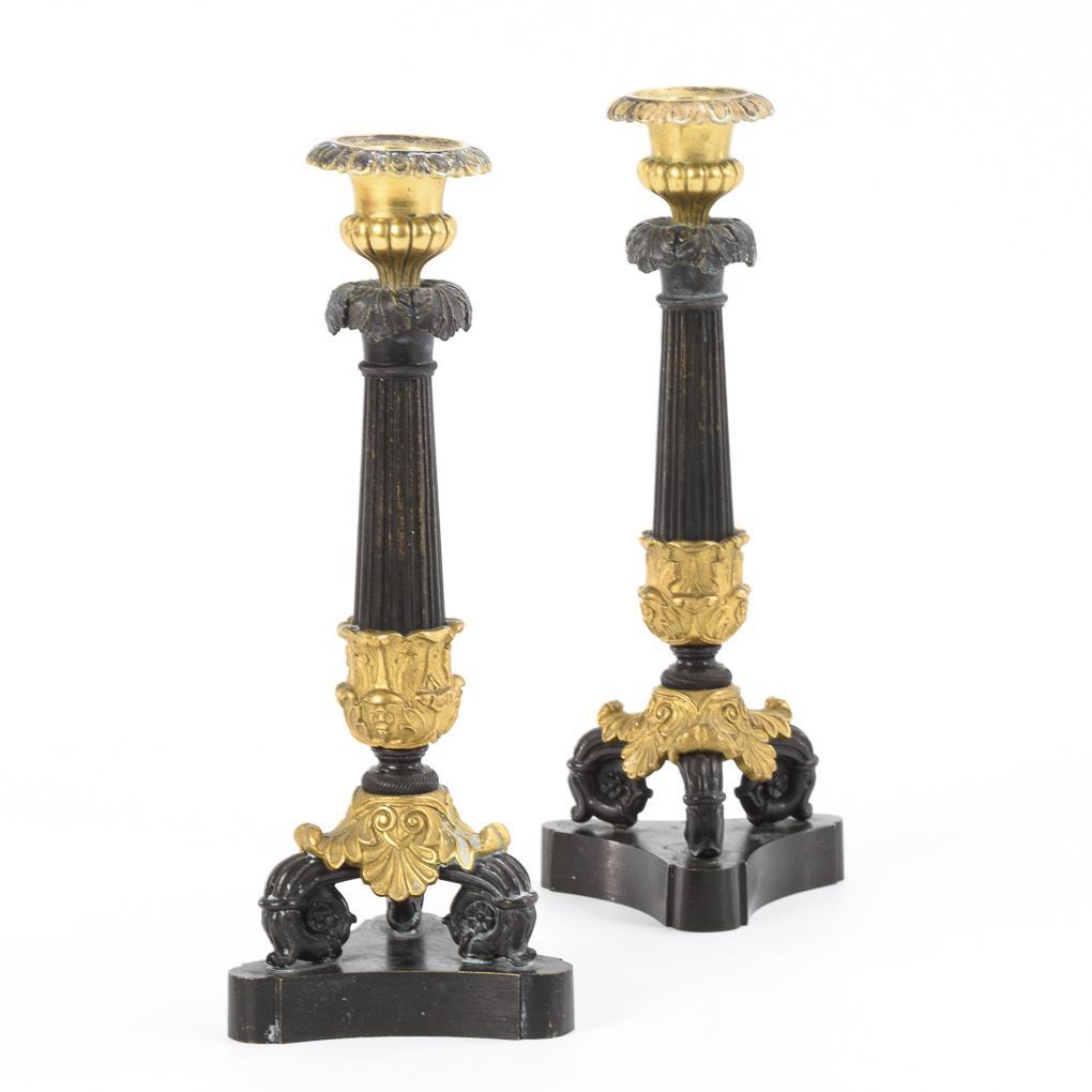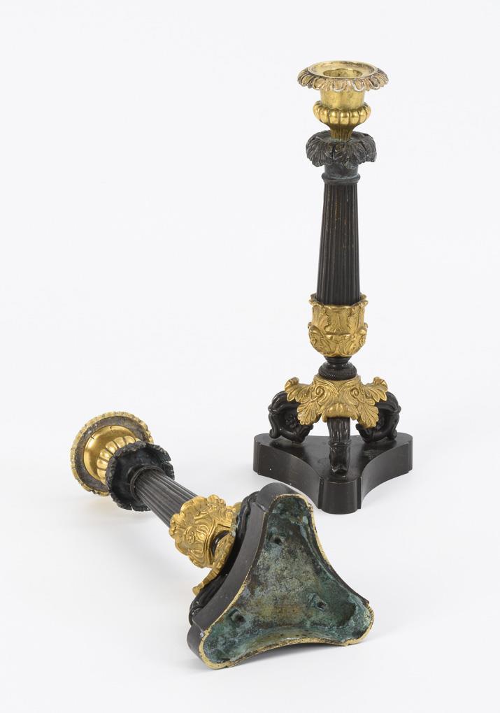 Classical bronze chandelier with 3 foliate volute feet on the 3-sided plinth, fluted shaft with leaf base and capital and vase spout. Slightly rubbed/dirty.
