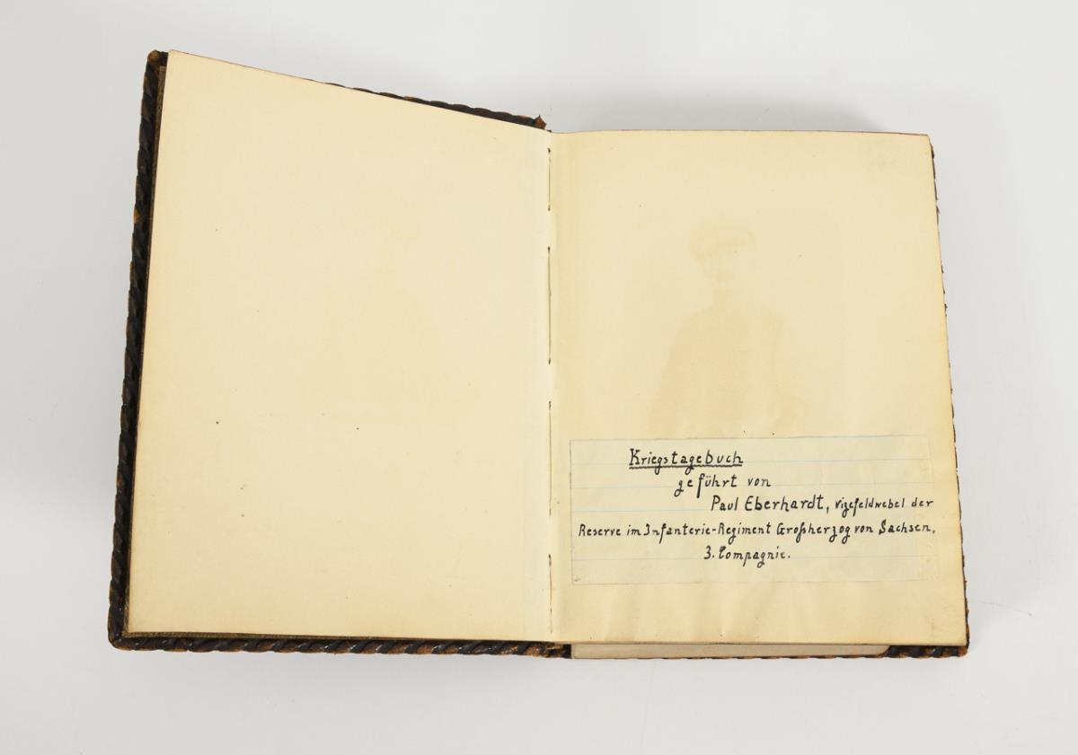 "War Diary kept by Paul Eberhardt, Vice Sergeant of the Reserve in the Infantry Regiment Grand Duke of Saxony, 3rd Company", 284 pages and some ads and photos. Probably copied later by two different hands. In leather binding with metal cross.