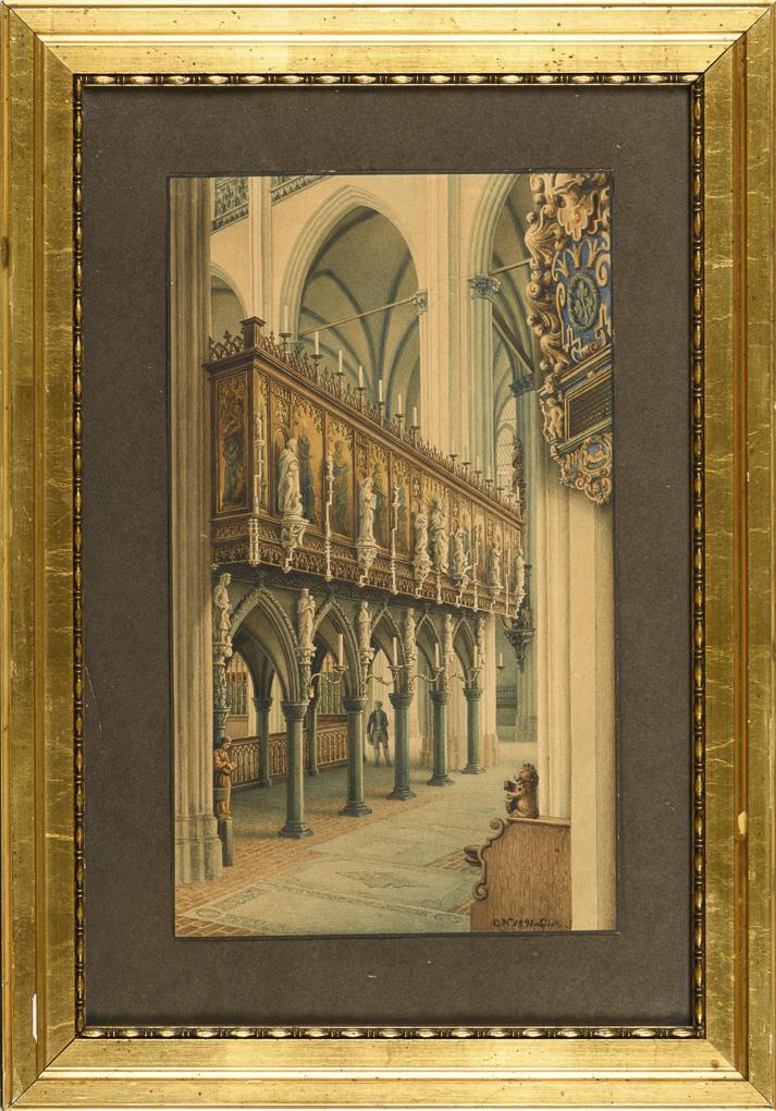 Interior view of a church with richly carved Gothic furnishings and staffage figure.