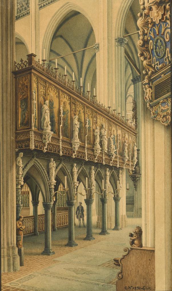 Interior view of a church with richly carved Gothic furnishings and staffage figure.